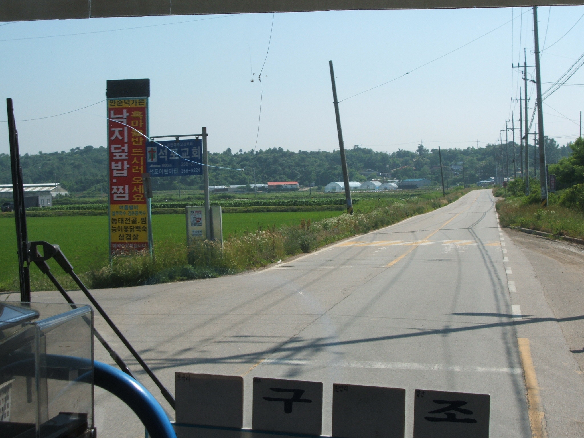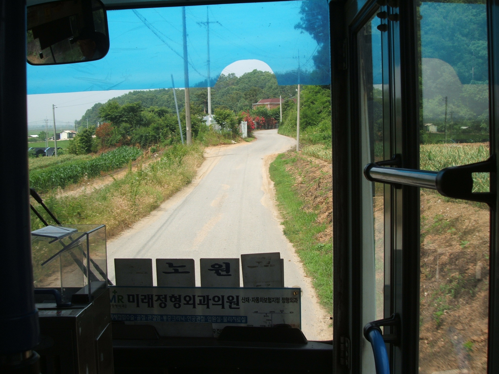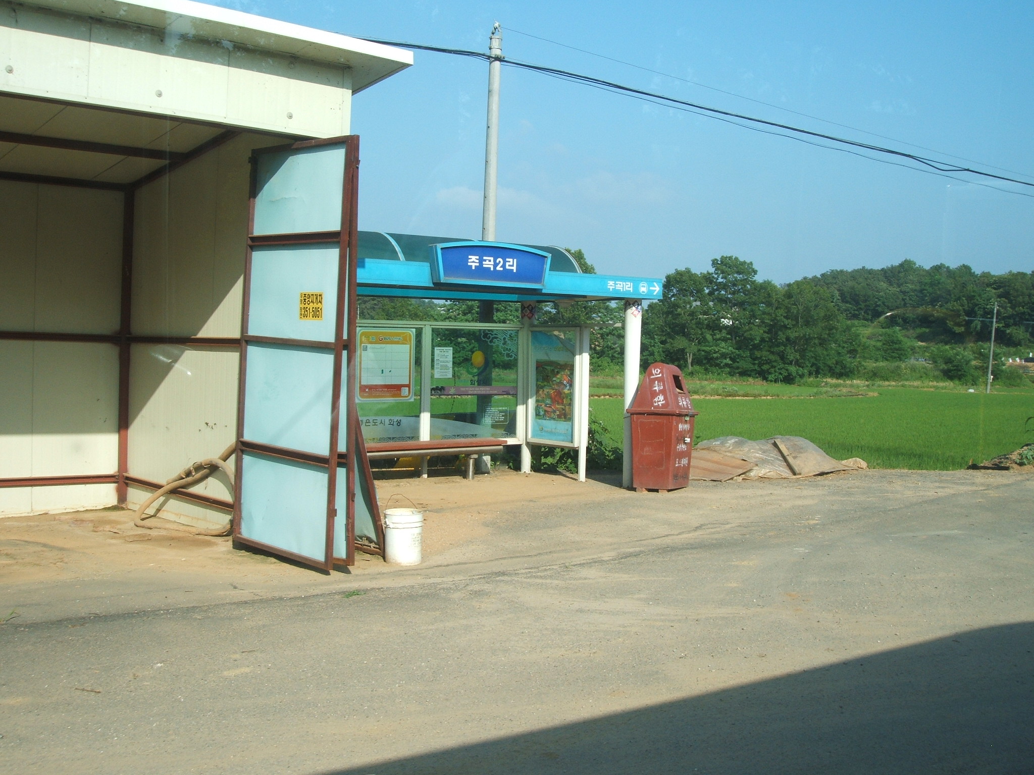 이번에는 시간 여유가 많아 느긋하게 바람도 쐬면서 걸어갈 수 있어서 좋더군요. 조암 방향으로 올라가니 사곡2리 정류장이 보이는데, 햇빛이 따가워서 그늘에 좀 대피해 있다가 오후 1시가 넘자 정류장으로 다시 나와 버스를 기다렸죠. 그랬더니 금방 노진리행 버스가 오는데, 이화4리도 가는 때임에도 불구하고 이화4리는 안 꽂혀 있었지만 어쨌든 얼른 버스를 세워 승차했습니다.