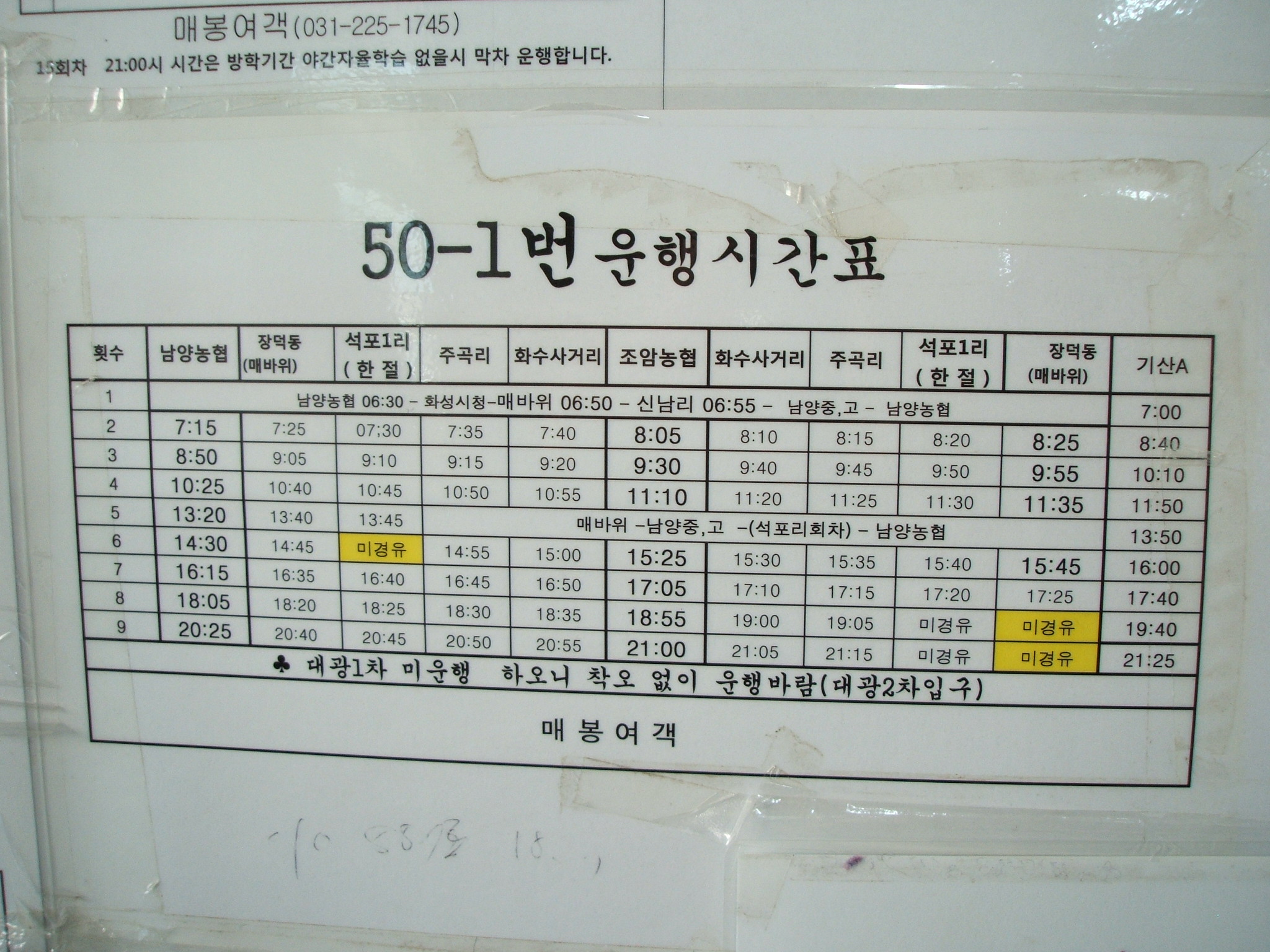 또한 이건 매냐들의 현주소와 일부 사람들의(-ㅅ-) 수준, 더 나아가 버스계의 수준이란 어떤지 아주 잘 보여주는 단면이기도 했습니다. 이제 이 글 올라왔으니 그렇게 가볼 분들이 없진 않겠지만, 조암에 시간표가 없는 것도 아니고 터미널만 가면 보기 좋게 잘 붙어 있는 게 시간표인데(그렇다고 이화리와 안중 차가 아예 다른 칸에 적힌 것도 아니고), 그 전에는 그렇게 가 볼 수는 없었던 것인가 묻고 싶어졌습니다. 이 시승이라는 것도 얼마든지 업그레이드가 될 수가 있는데 그런 식이니 시간이 가도 진보는 없고 걍 그냥저냥인 거라는 그분의 말씀이 이렇게 공감이 가는 현실이라니 말이죠. -ㅅ-;;;