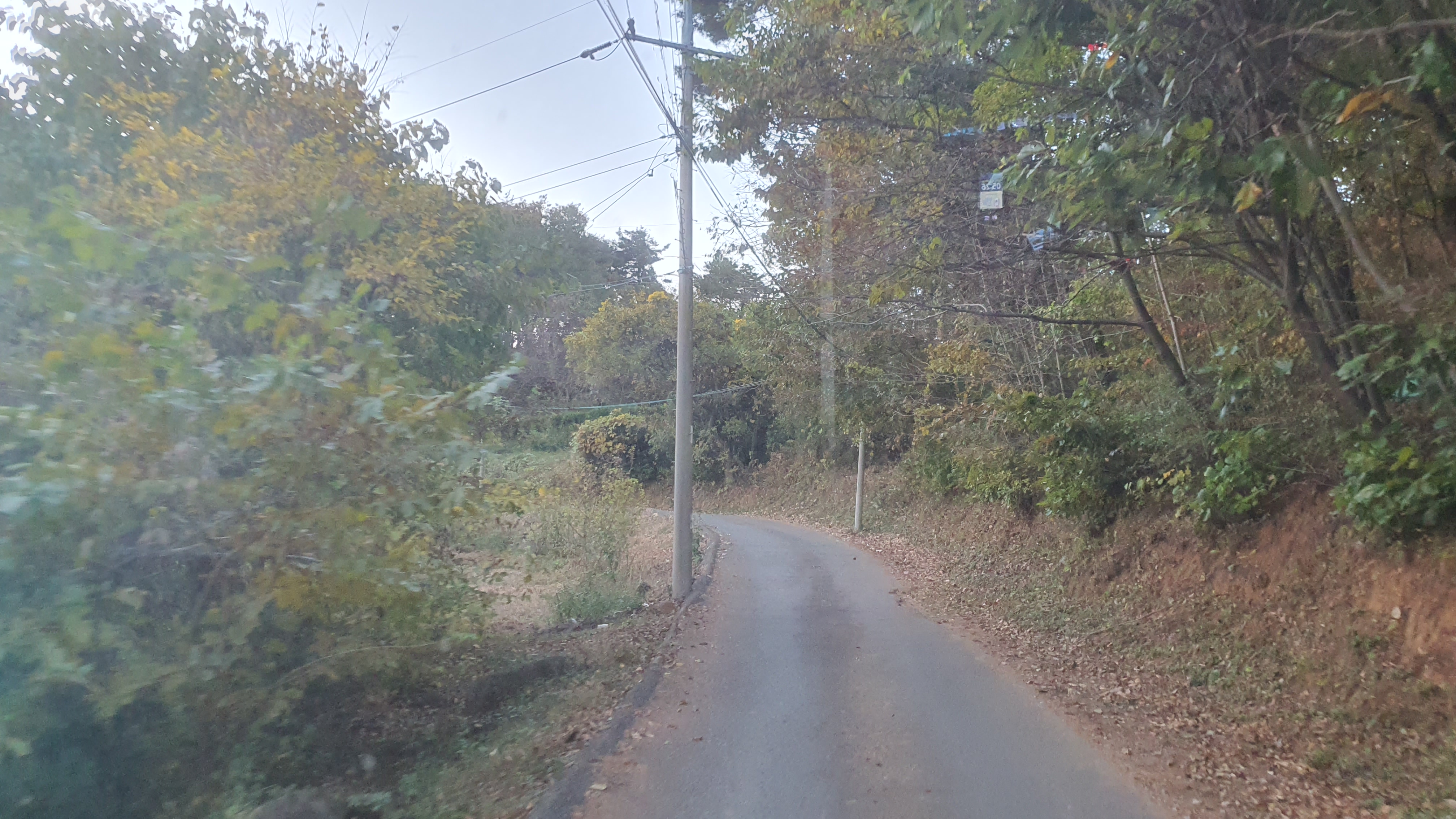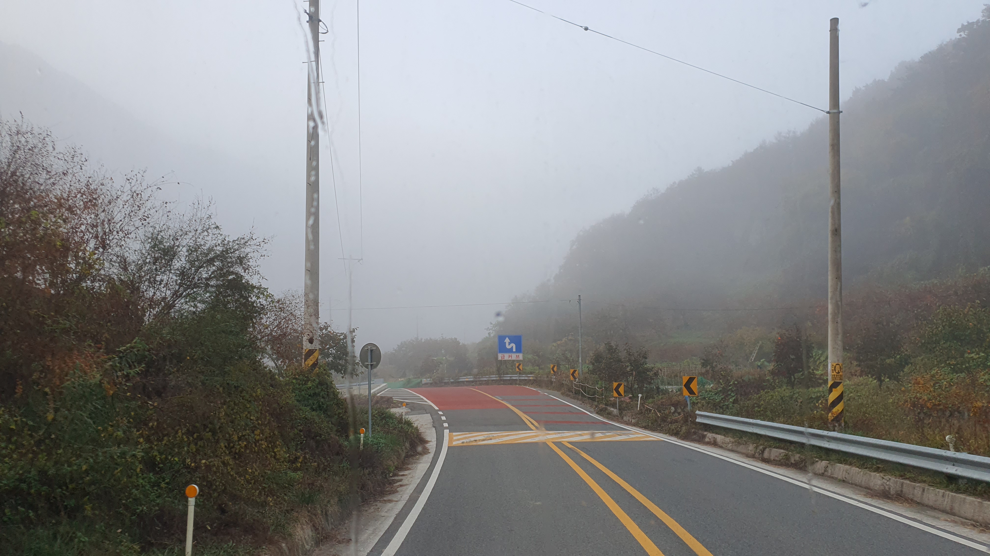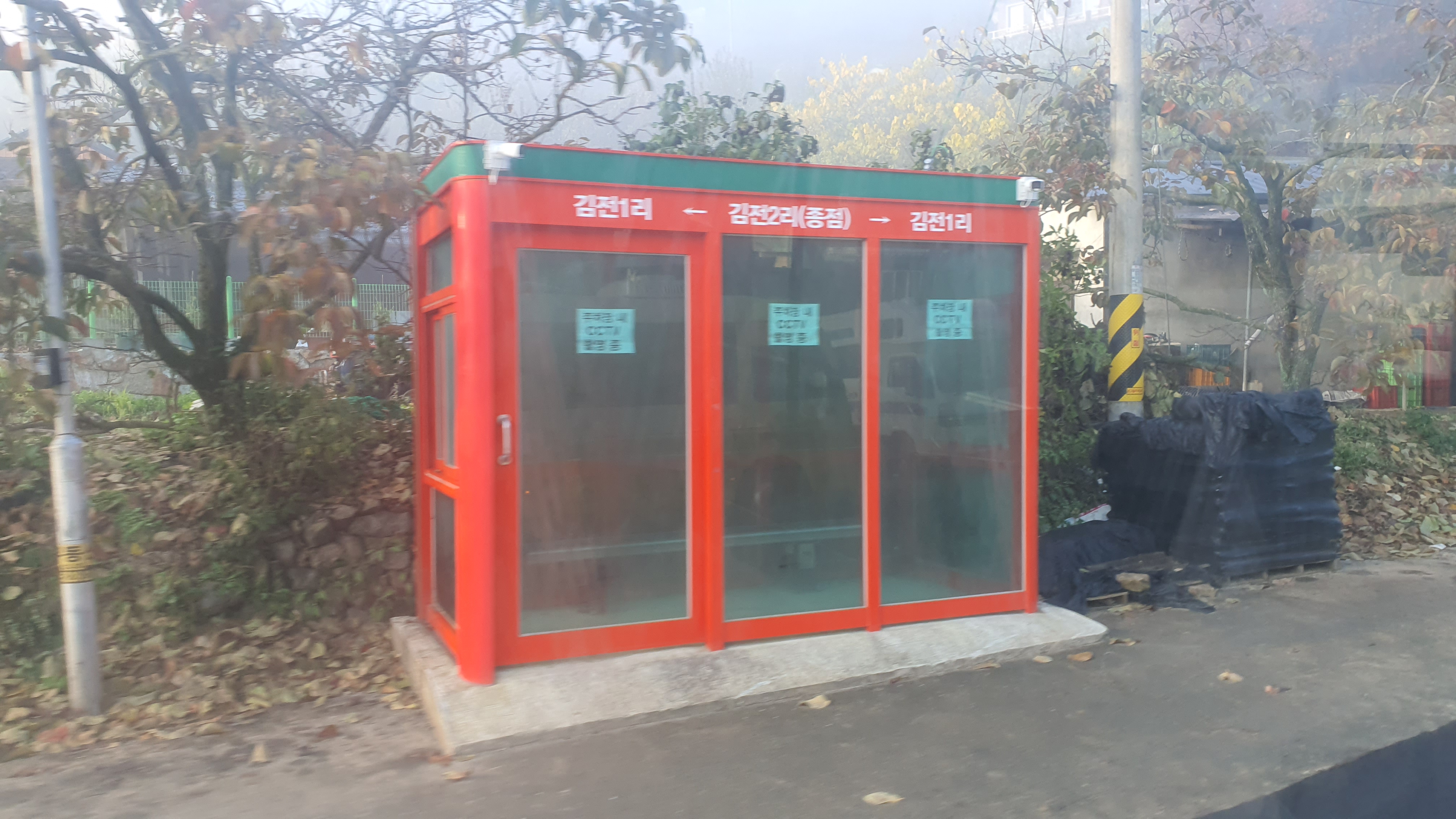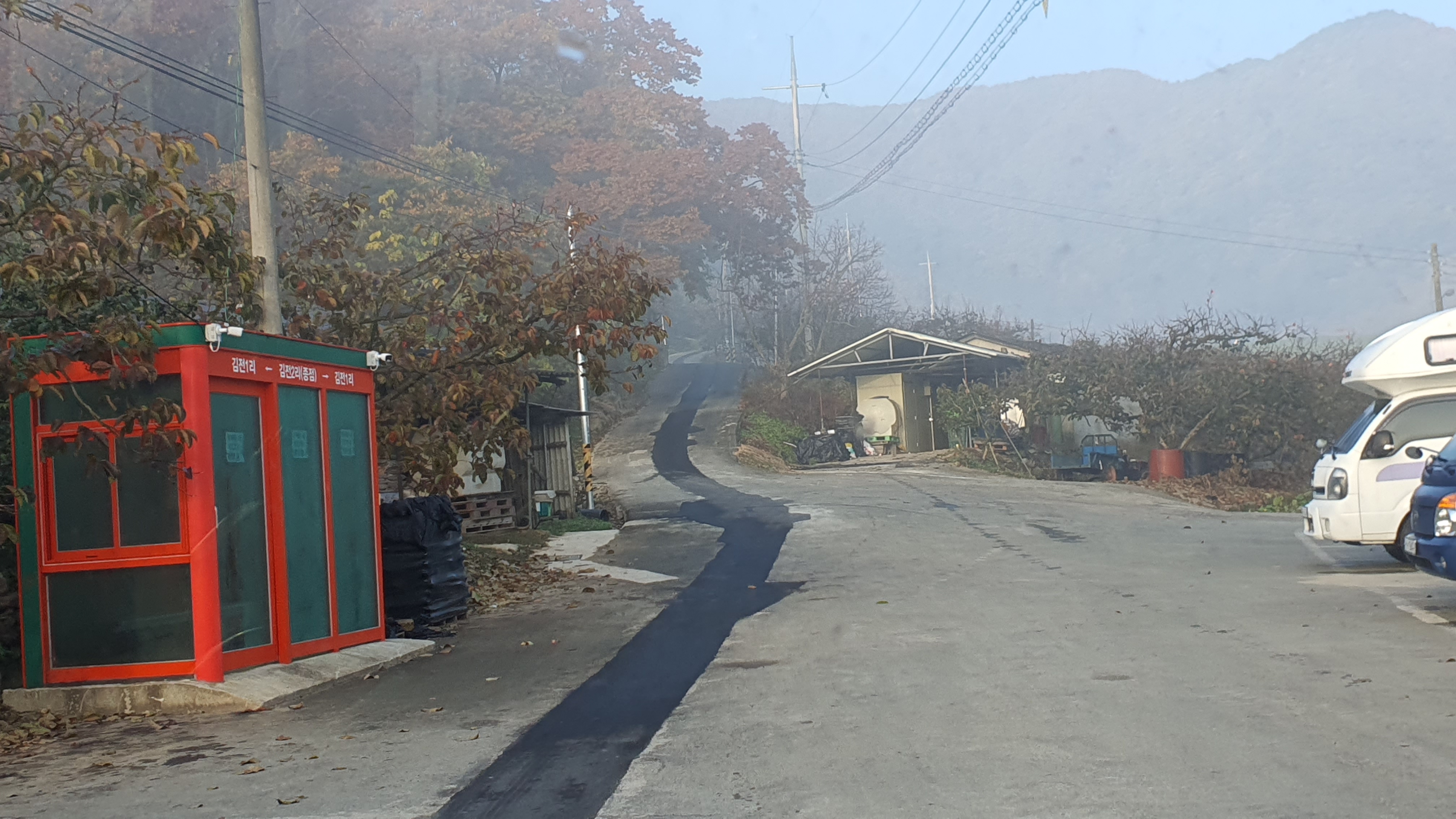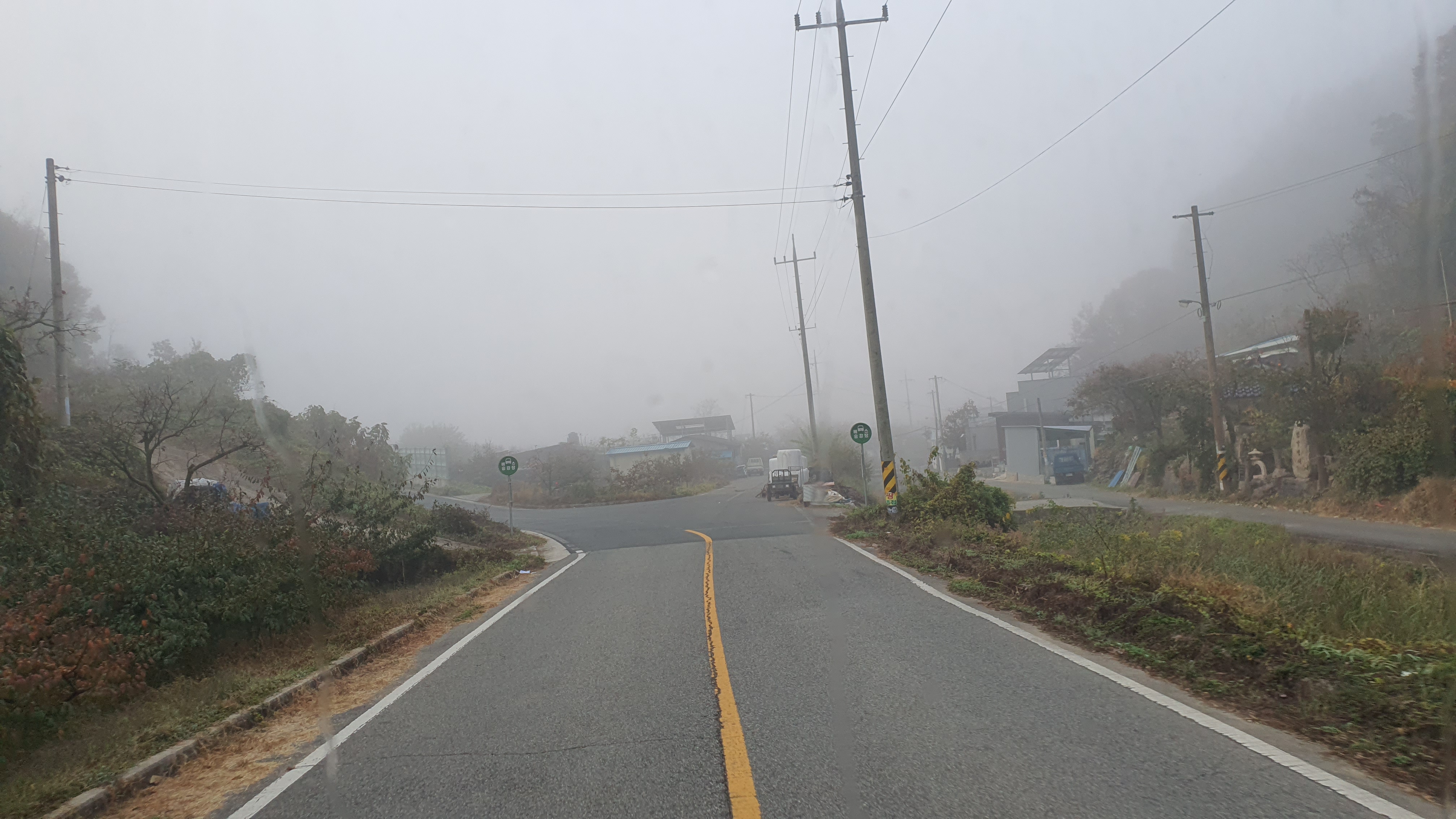 돈치재터널을 넘어오니 다시 안개가 좀 끼어 있었지만 아까 청도역에서만큼 자욱하진 않았습니다. 내리막을 내려오니 김전2리가 나왔는데, 이 버스가 김전2리 안길을 들어가주더군요. 김전2리는 동곡에서 갈고개로 가는 노선이 ㅓ형으로 들르는 곳이라서 행복버스는 마을 안으로 들어가지 않을 거라 예상했었는데, 의도치 않게 여기를 가보는 이득이 생기네요. 쩌는 1차로 길 역시 챙겨가구요. 오우 ㅋㅋ