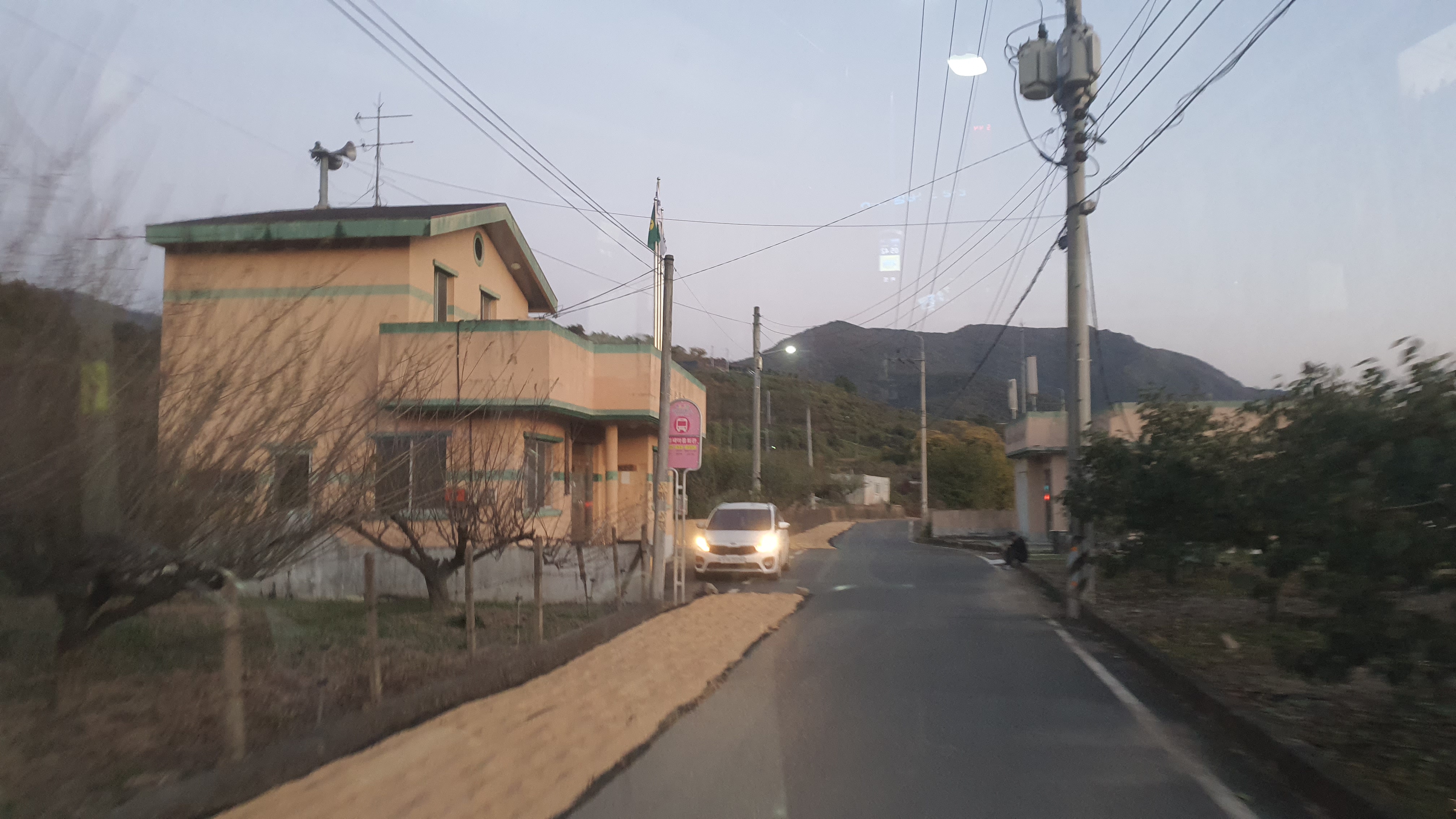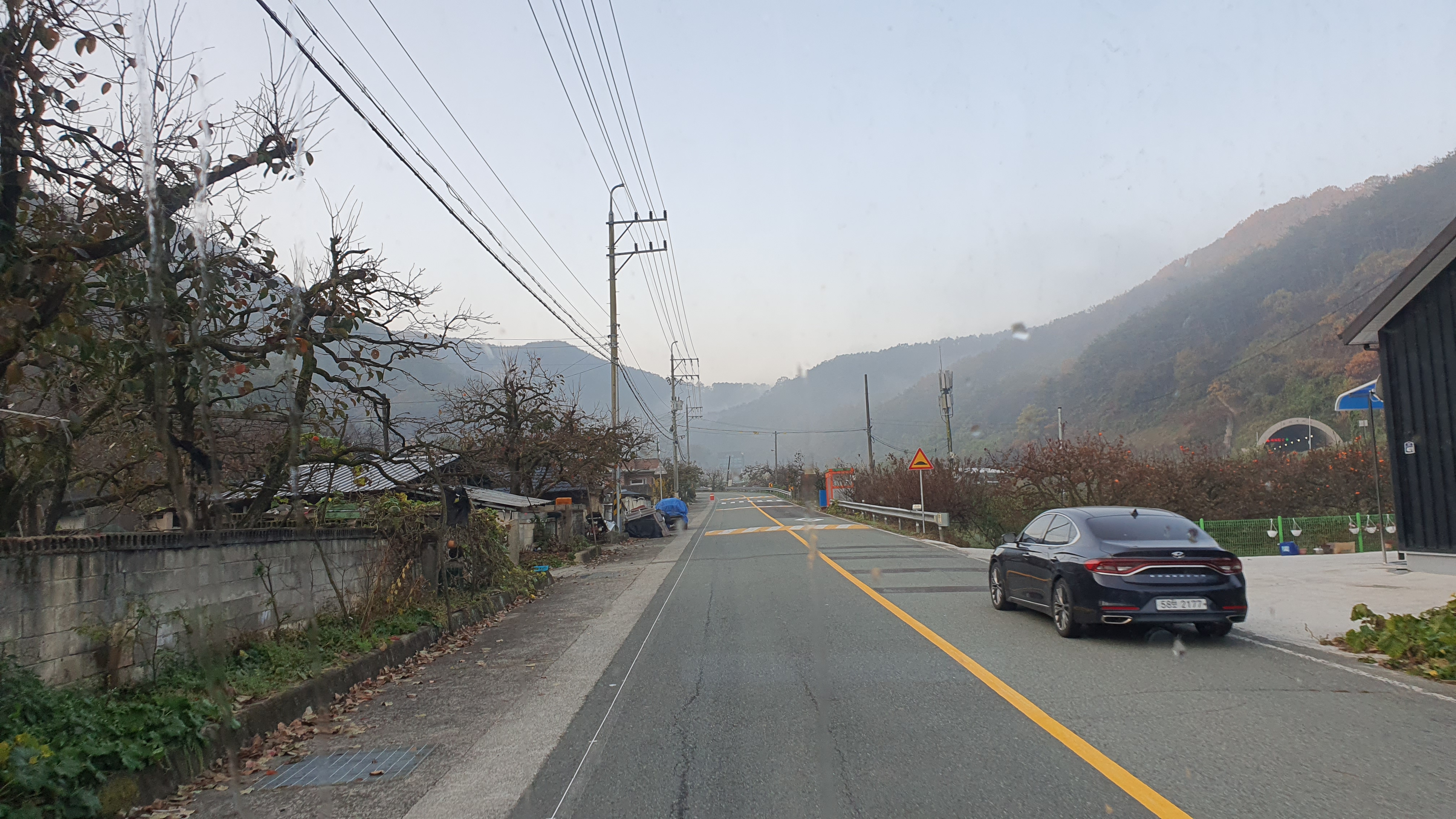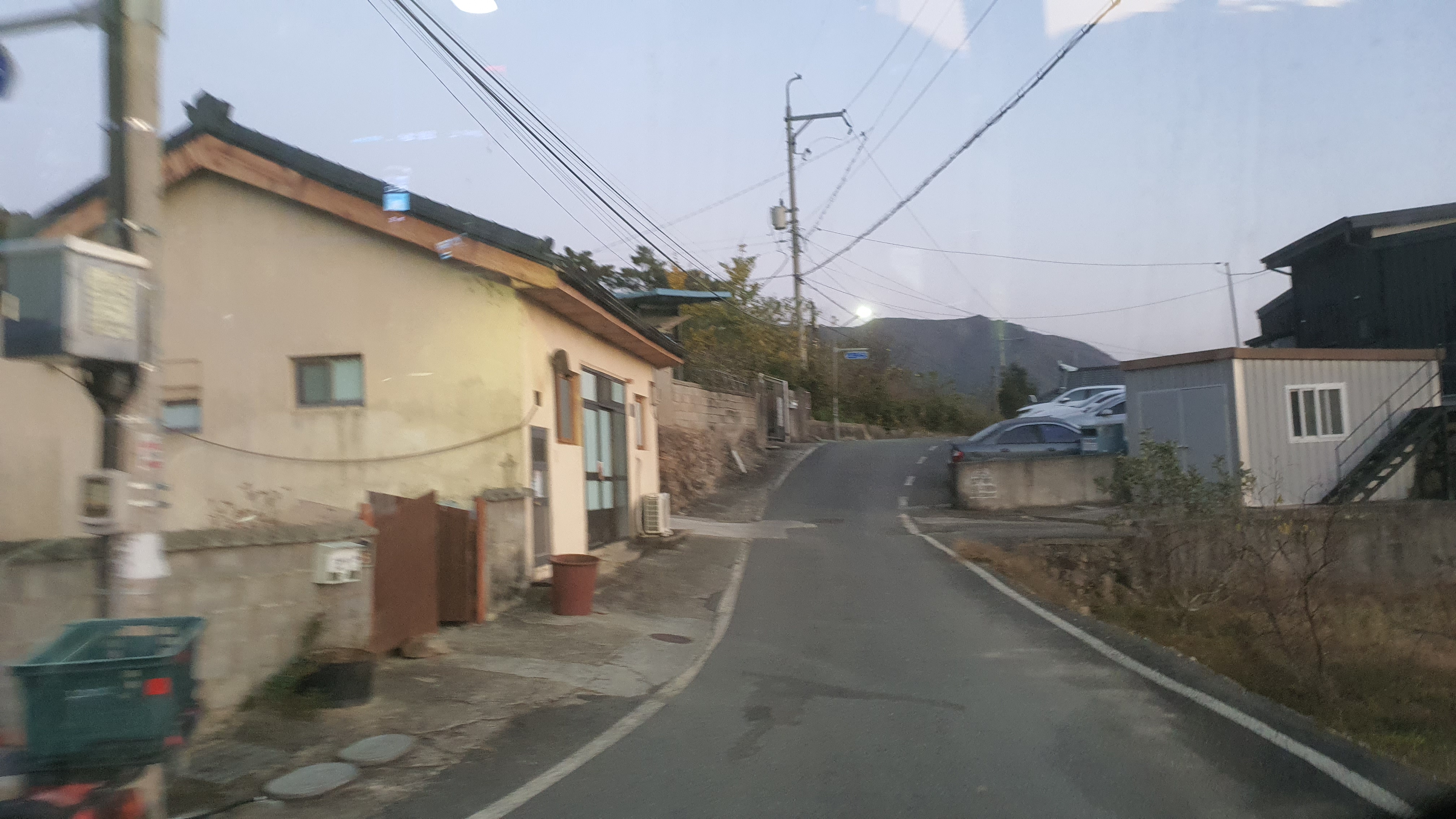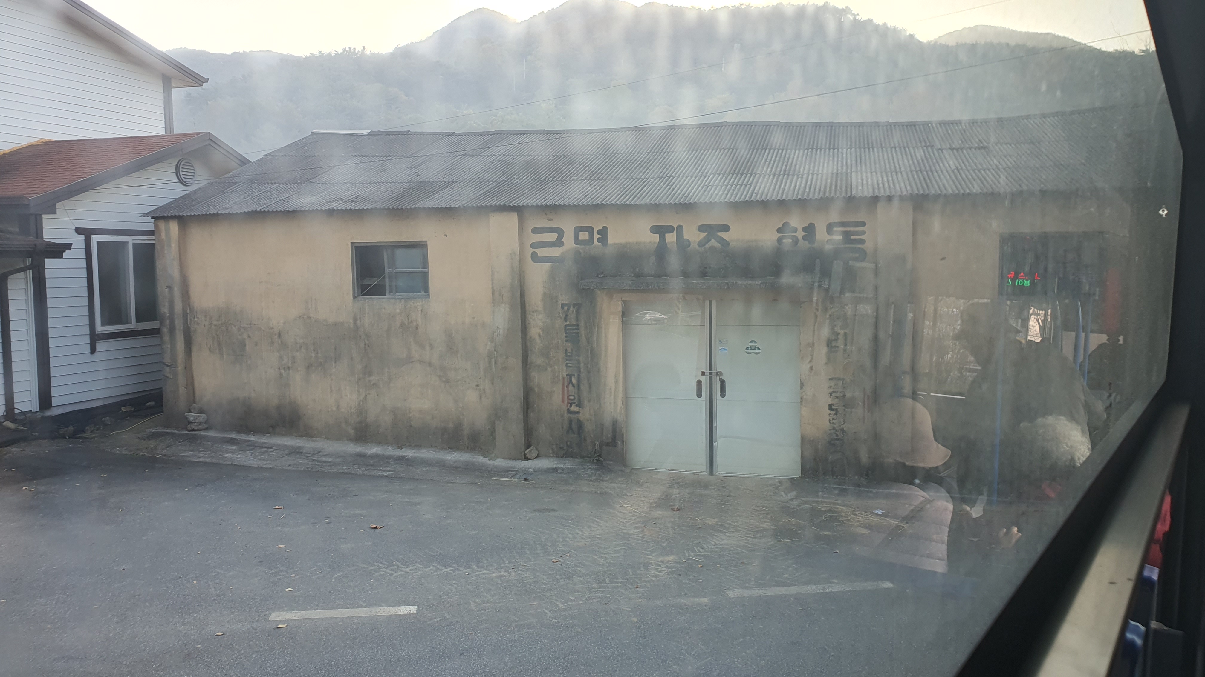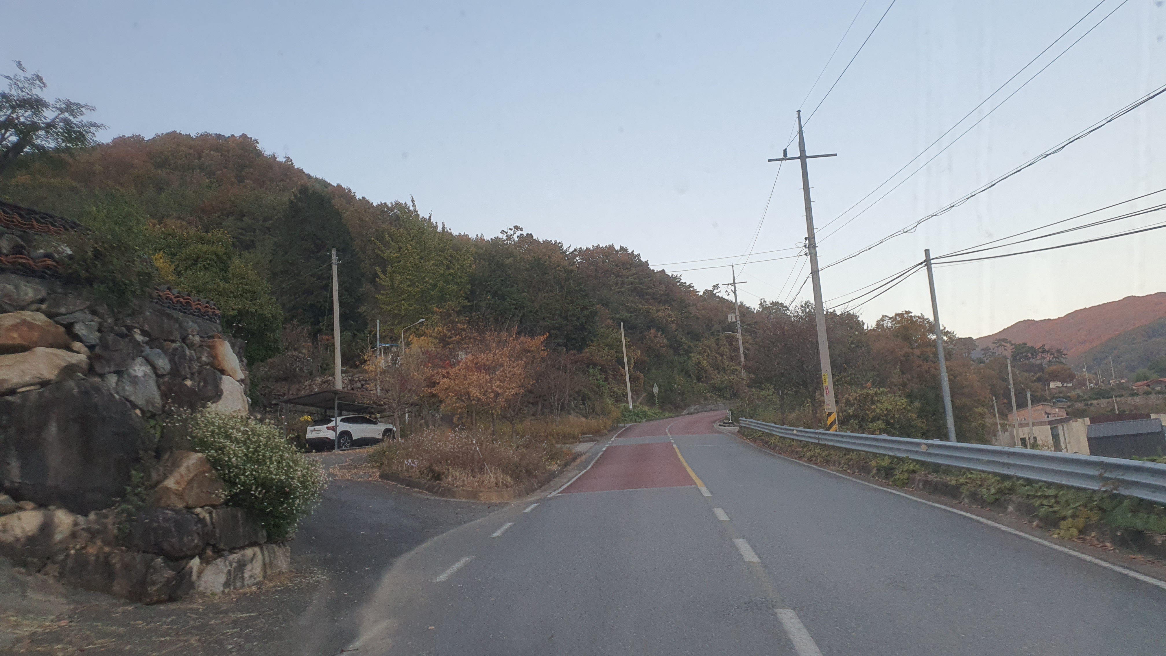 돈치재터널을 넘어오니 다시 안개가 좀 끼어 있었지만 아까 청도역에서만큼 자욱하진 않았습니다. 내리막을 내려오니 김전2리가 나왔는데, 이 버스가 김전2리 안길을 들어가주더군요. 김전2리는 동곡에서 갈고개로 가는 노선이 ㅓ형으로 들르는 곳이라서 행복버스는 마을 안으로 들어가지 않을 거라 예상했었는데, 의도치 않게 여기를 가보는 이득이 생기네요. 쩌는 1차로 길 역시 챙겨가구요. 오우 ㅋㅋ