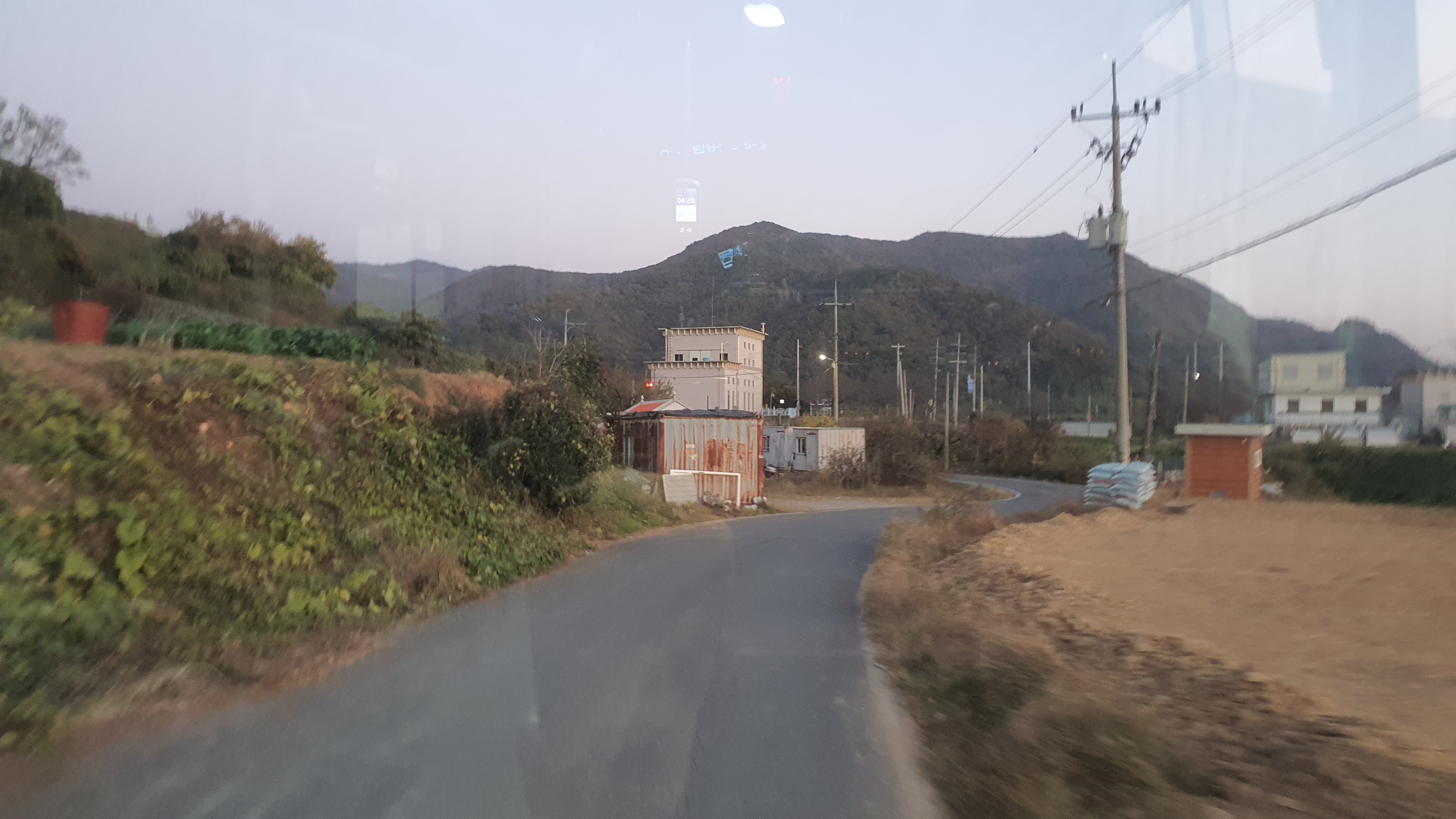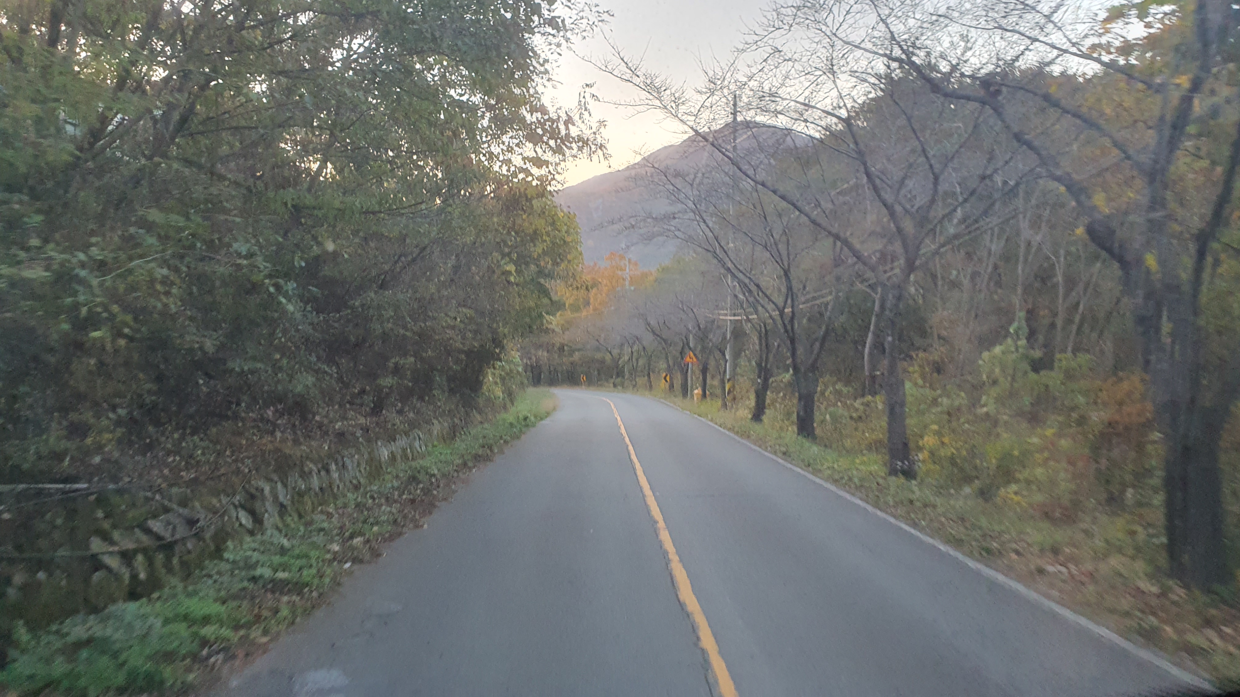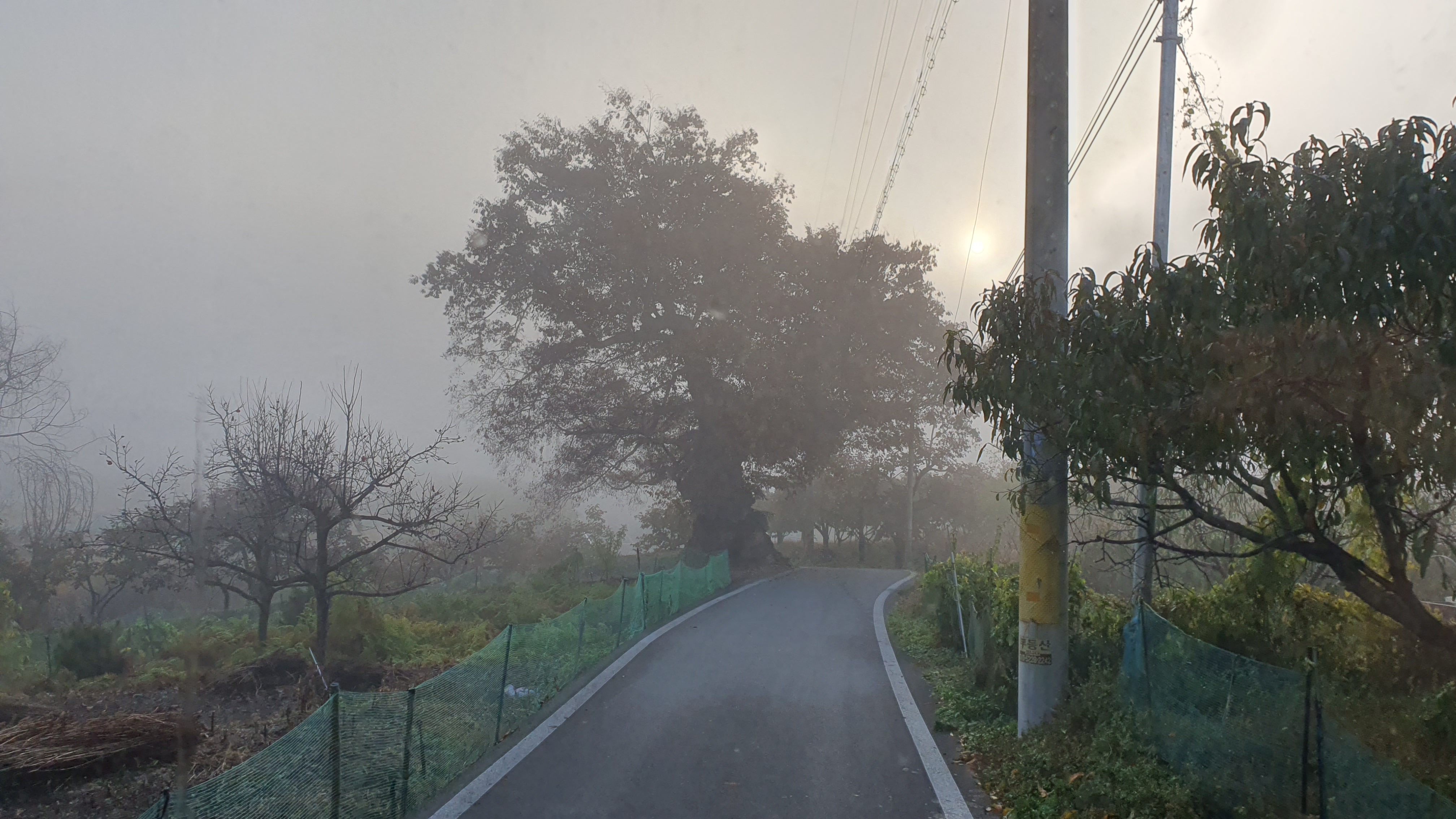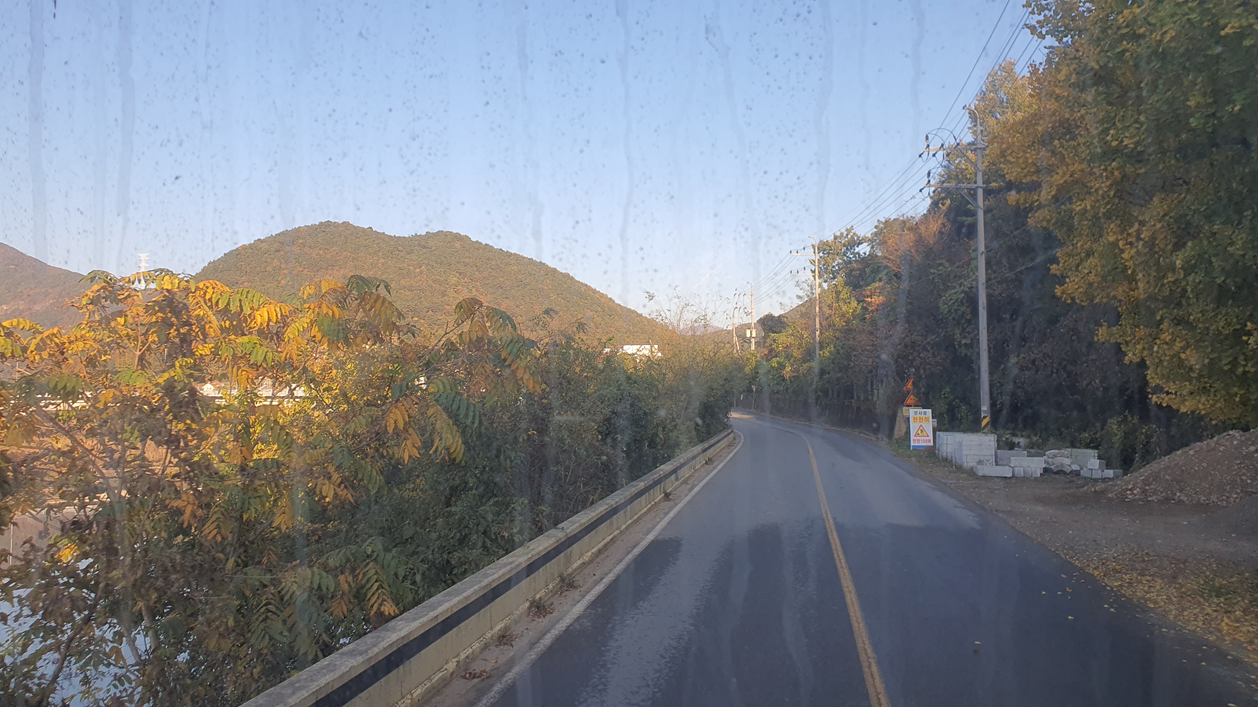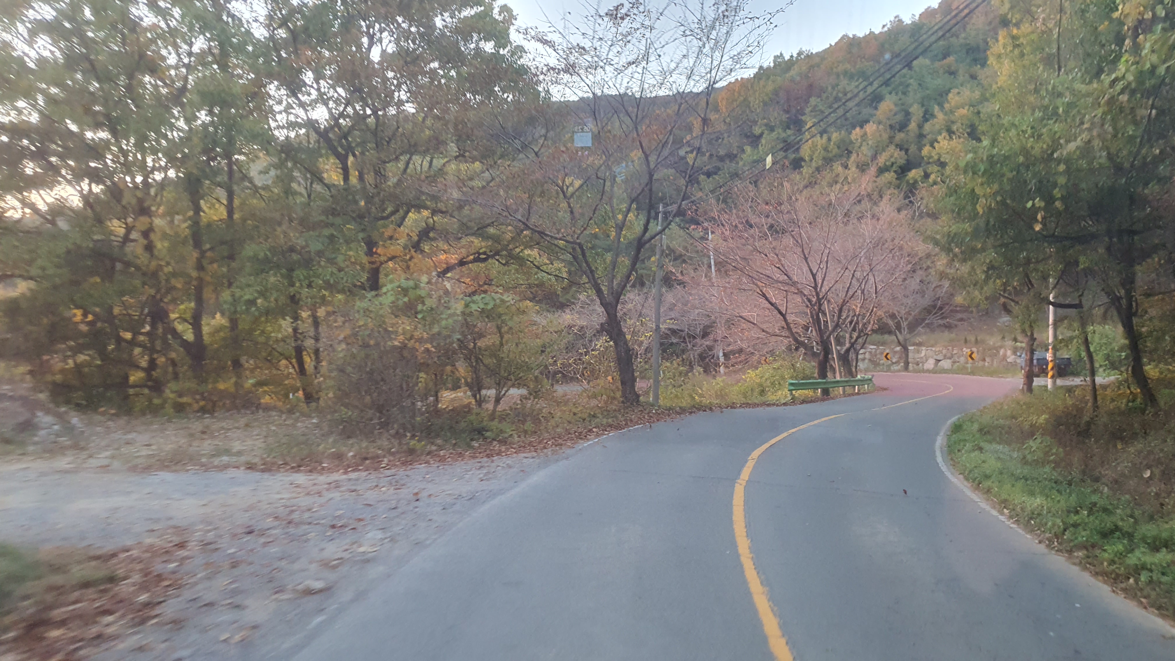 돈치재터널을 넘어오니 다시 안개가 좀 끼어 있었지만 아까 청도역에서만큼 자욱하진 않았습니다. 내리막을 내려오니 김전2리가 나왔는데, 이 버스가 김전2리 안길을 들어가주더군요. 김전2리는 동곡에서 갈고개로 가는 노선이 ㅓ형으로 들르는 곳이라서 행복버스는 마을 안으로 들어가지 않을 거라 예상했었는데, 의도치 않게 여기를 가보는 이득이 생기네요. 쩌는 1차로 길 역시 챙겨가구요. 오우 ㅋㅋ