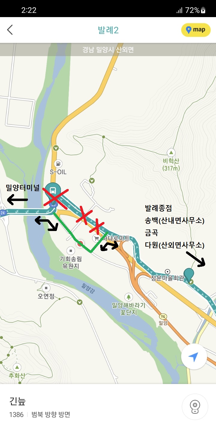 지금 상황에서는 엄광리 노선이라도 타야 했던 겁니다. 발례는 버스가 하루 2번만 가는 곳이라 종점까지 가보고 싶었지만, 발례종점에 가는 순간 오늘 감물리와 삼랑진 아리랑버스는 무조건 날아가기 때문에 포기할 수밖에 없었죠. 발례종점으로 미리 걸어들어가든 종점에서 걸어나오든, 믿었던 밀성여객 시외버스도 불과 10~30분 이내로 시간이 맞질 않아서인데, 정말 아쉬웠지만 하는 수 없었습니다. -ㅅ-;;;