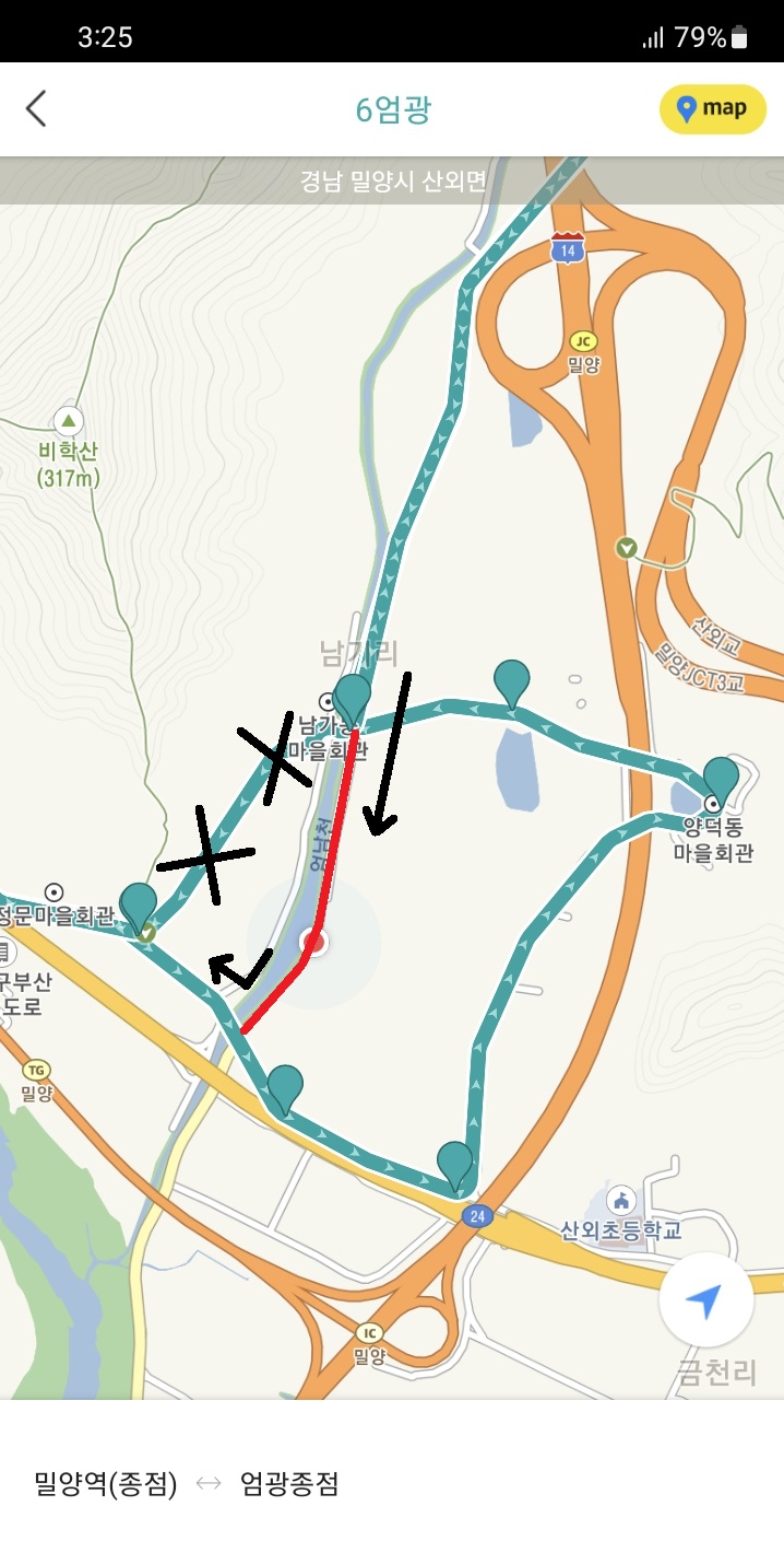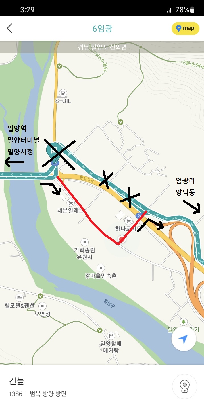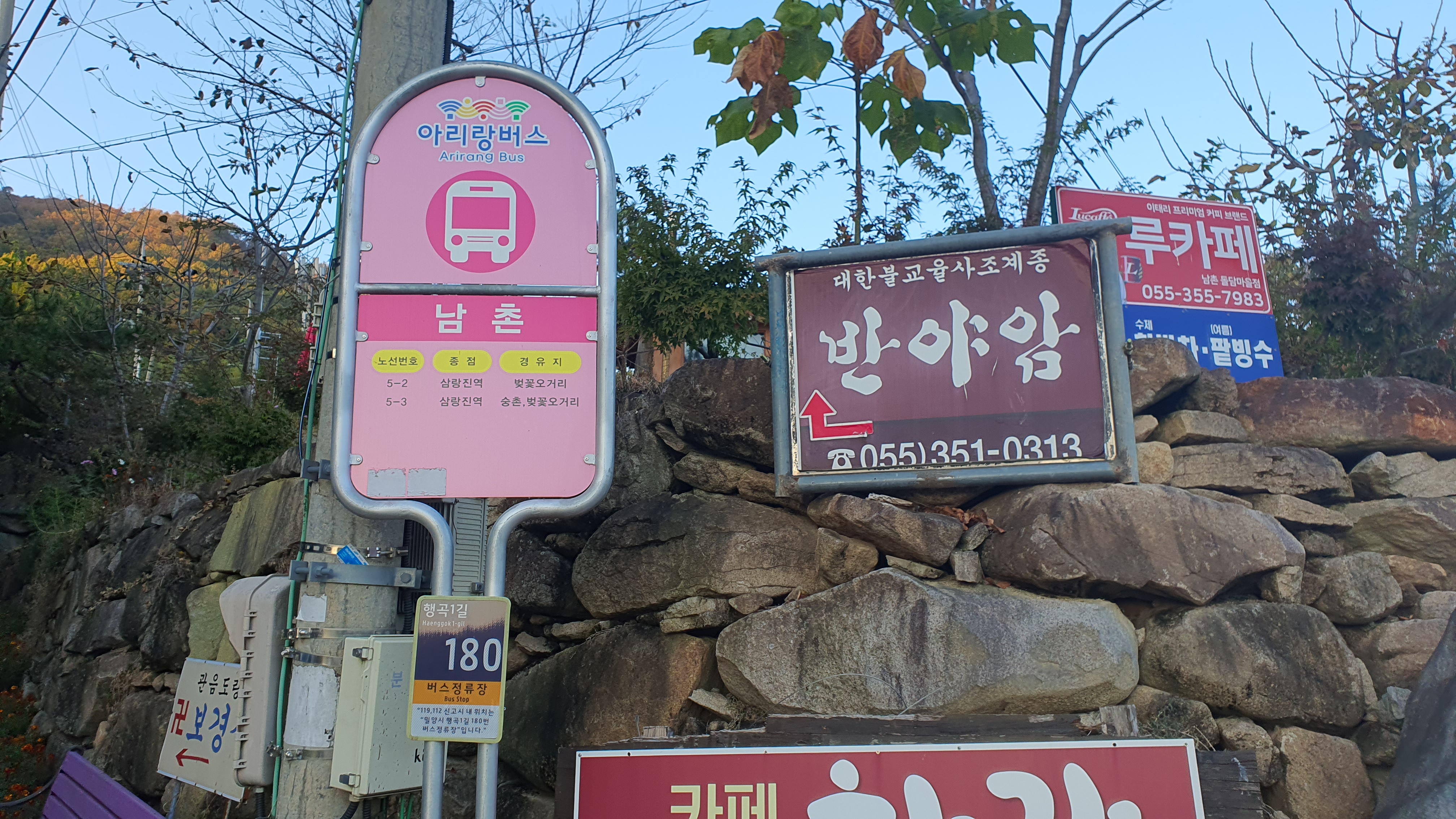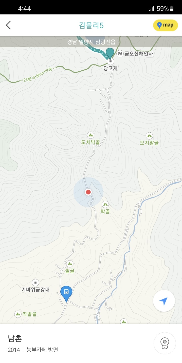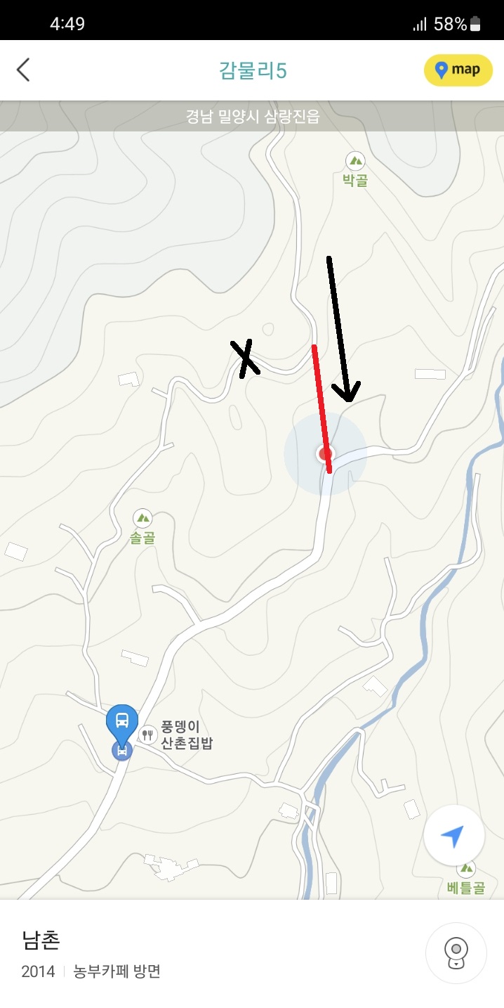 정말 오져버리는 모습을 카메라로 담으며 아래로 내려가니 지도로 보았던 피자집이 보이고, 곧 목적지에도 도착하였습니다. 삼랑진 아리랑버스가 오는 남촌 버스 회차지에 말입니다. 지도로 삼랑진 아리랑버스의 운행경로를 보면 산 속으로 정말 깊숙히 들어가는 무시무시한 포스를 느낄 수 있는데, 대단히 어려워 보였던 이 노선을 이렇게 타게 되다니 정말 소름돋을 따름입니다.