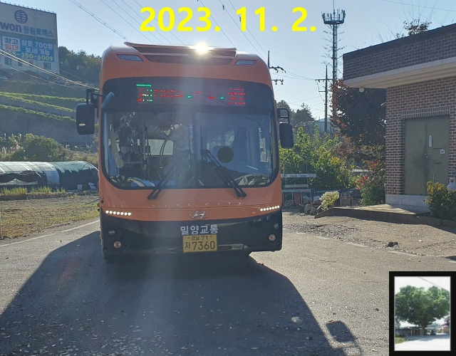 그런데 참으로 이상했던 것은, 꼭 이럴 때면 버스도 늦게 온다는 것입니다. 그나마 밀양은 카카오버스에서도 실시간 위치까지 나오기는 하는데, 버스가 오후 3시 4분쯤 도착할 각이었던 겁니다. 사실 엄광리 종점 출발시간은 있지만, 밀양은 일단 종점에 빠르게 도착하고 보는 경향이 있던데 어떻게 된 거지 -ㅅ-;;; 하여간 저는 세상에서 가장 긴 것만 같은 5분을 버티고, 버스가 도착할 쯤 회관으로 가서 버스를 탔습니다. 밀양 오지에서 전기버스인 일렉시티를 타보게 될 거라고는 생각지도 못했습니다. ㅋㅋ
