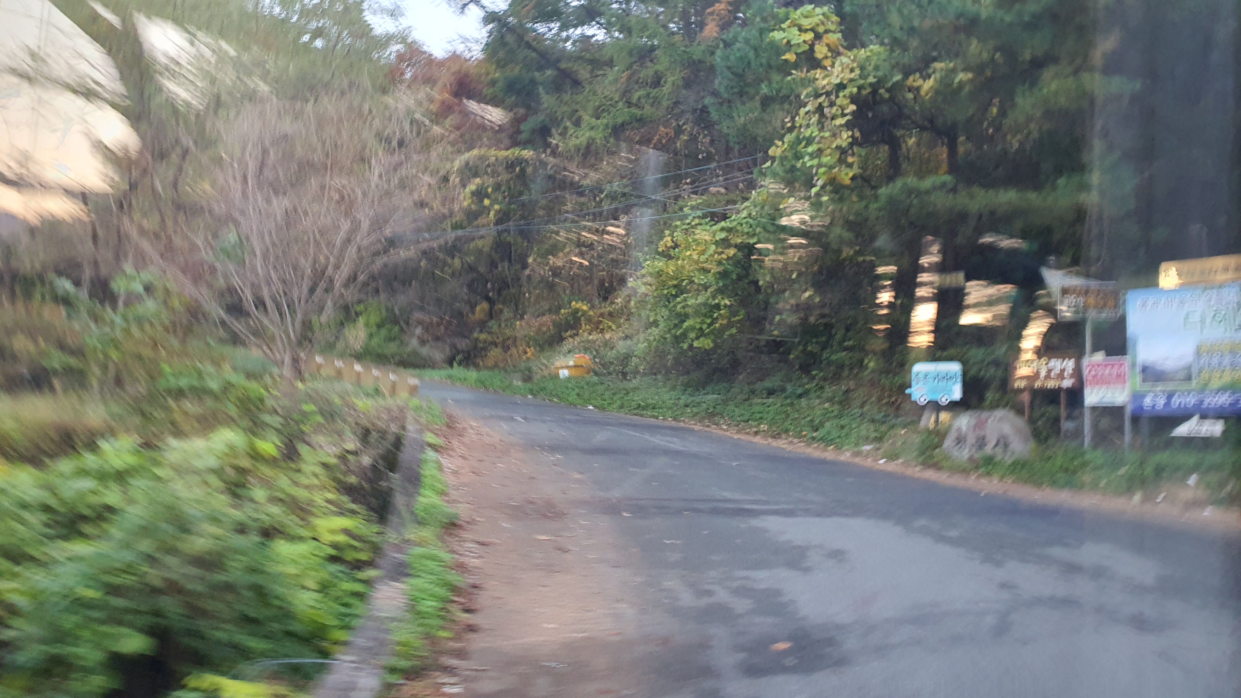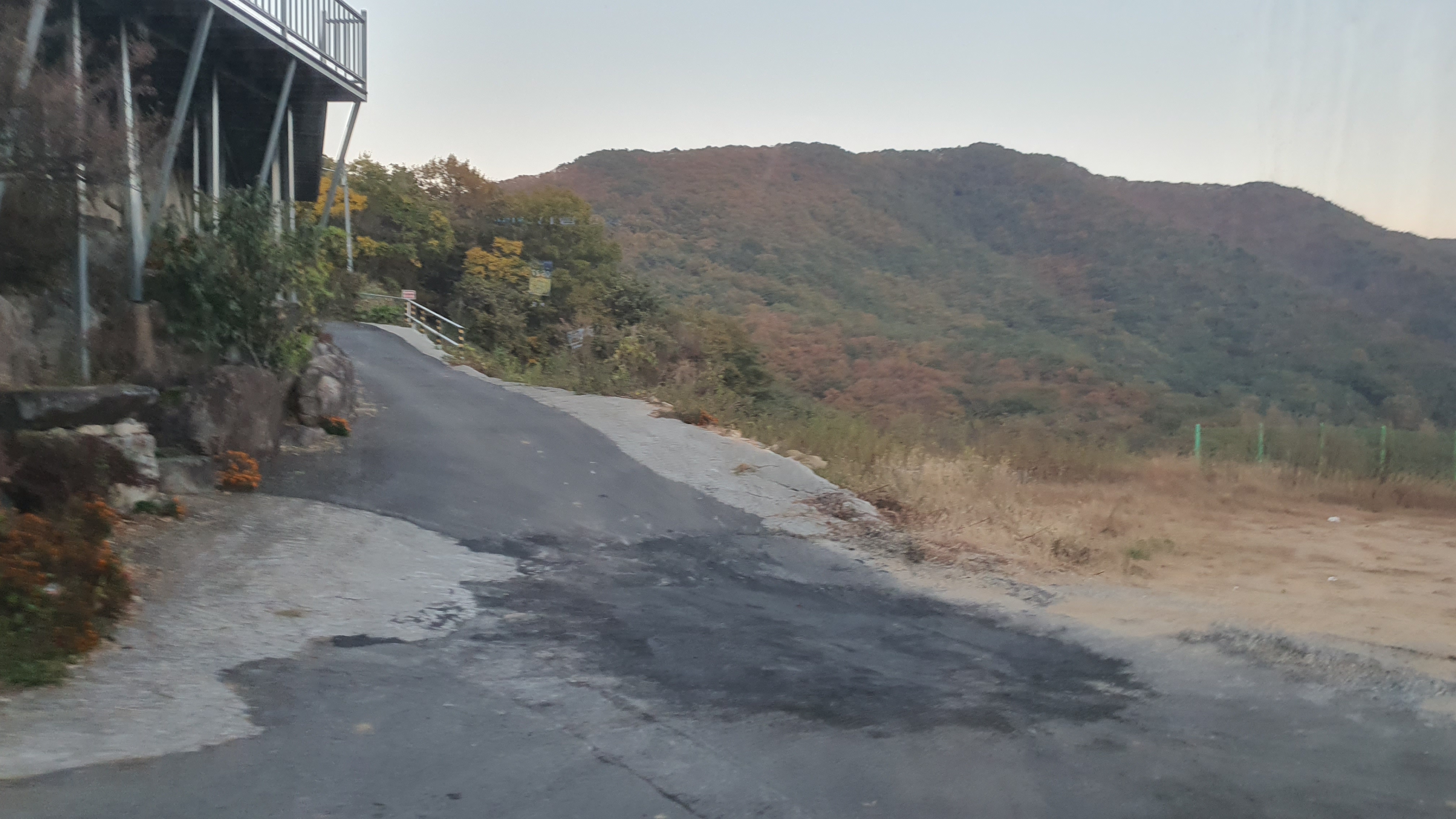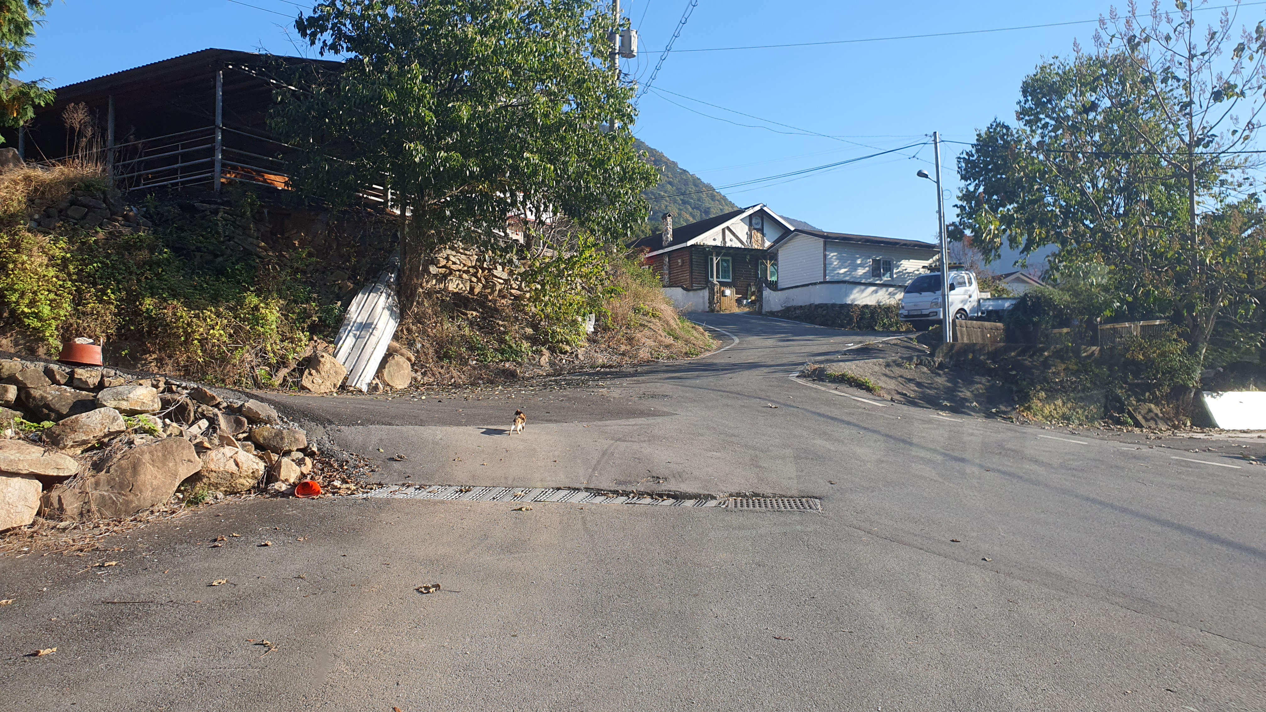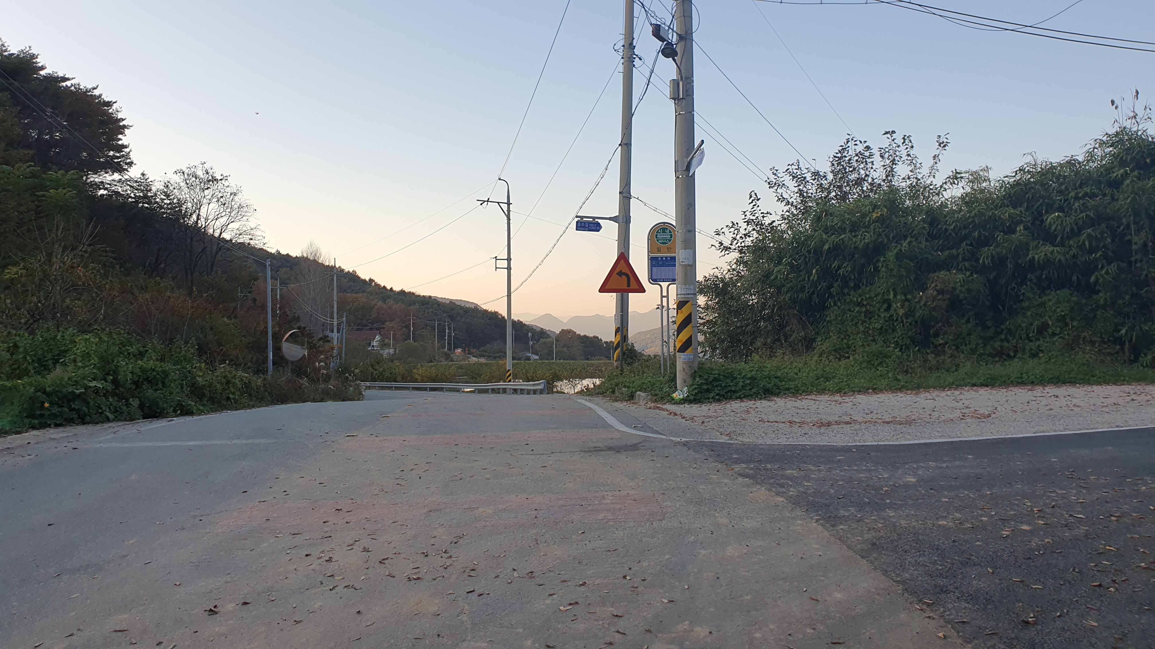 다음 버스는 오후 7시 20분이 되어야 옵니다. 이제는 정말 결전의 순간이 찾아오는데, 다행히 감물리 버스가 이 미칠듯한 오르막을 전부 올라와준 덕택에 이제는 내리막길을 따라 아래로 내려가는 일만이 남아있었습니다. 하지만 내리막을 내려가려던 저는 곧 장애물을 하나 만나게 되었습니다.