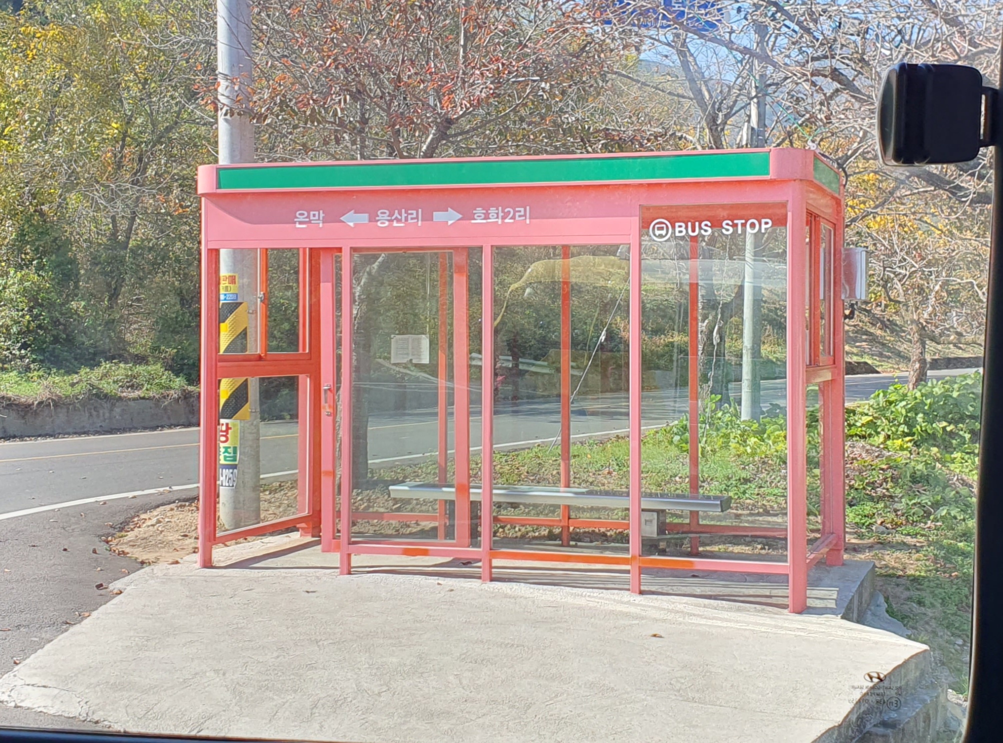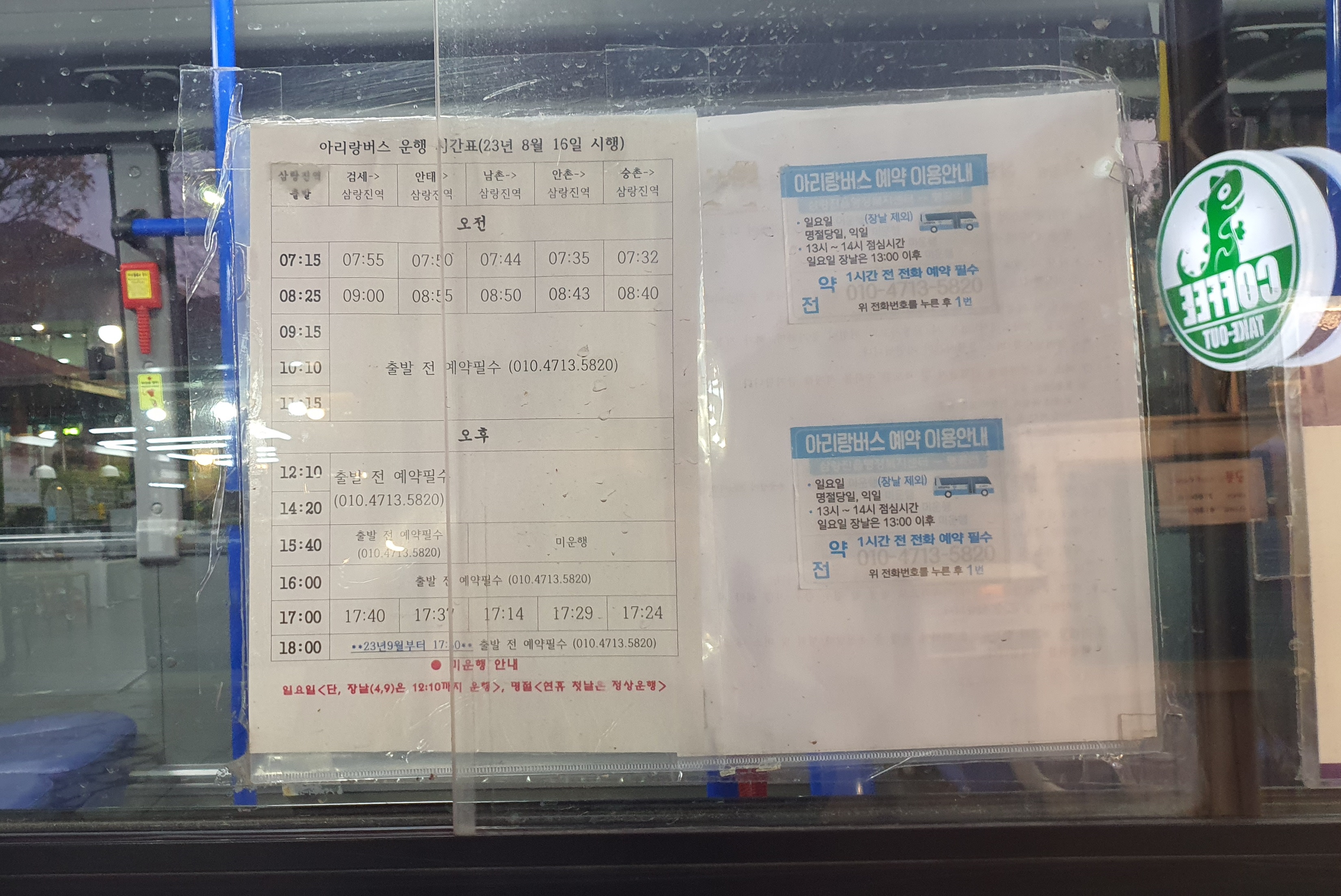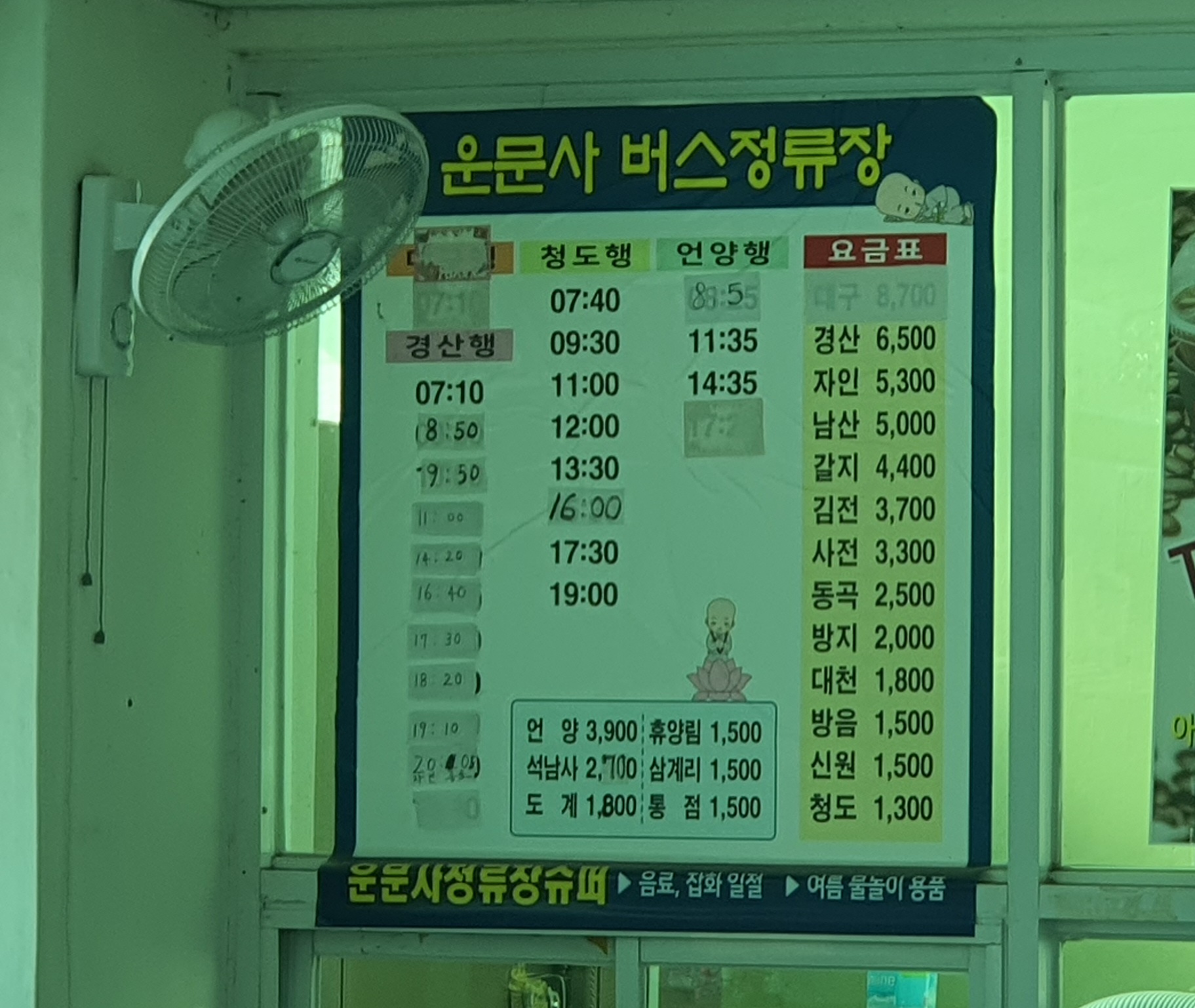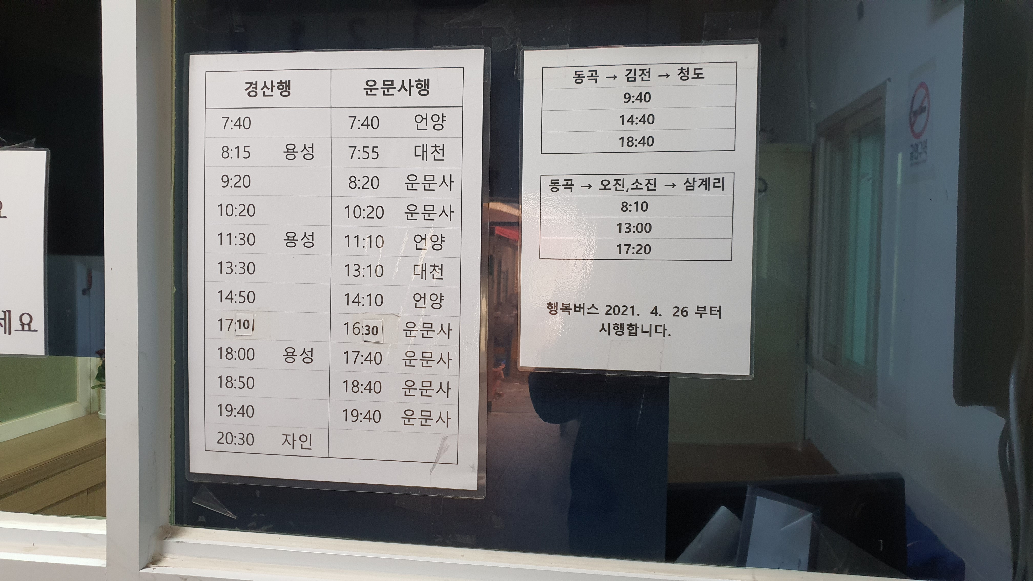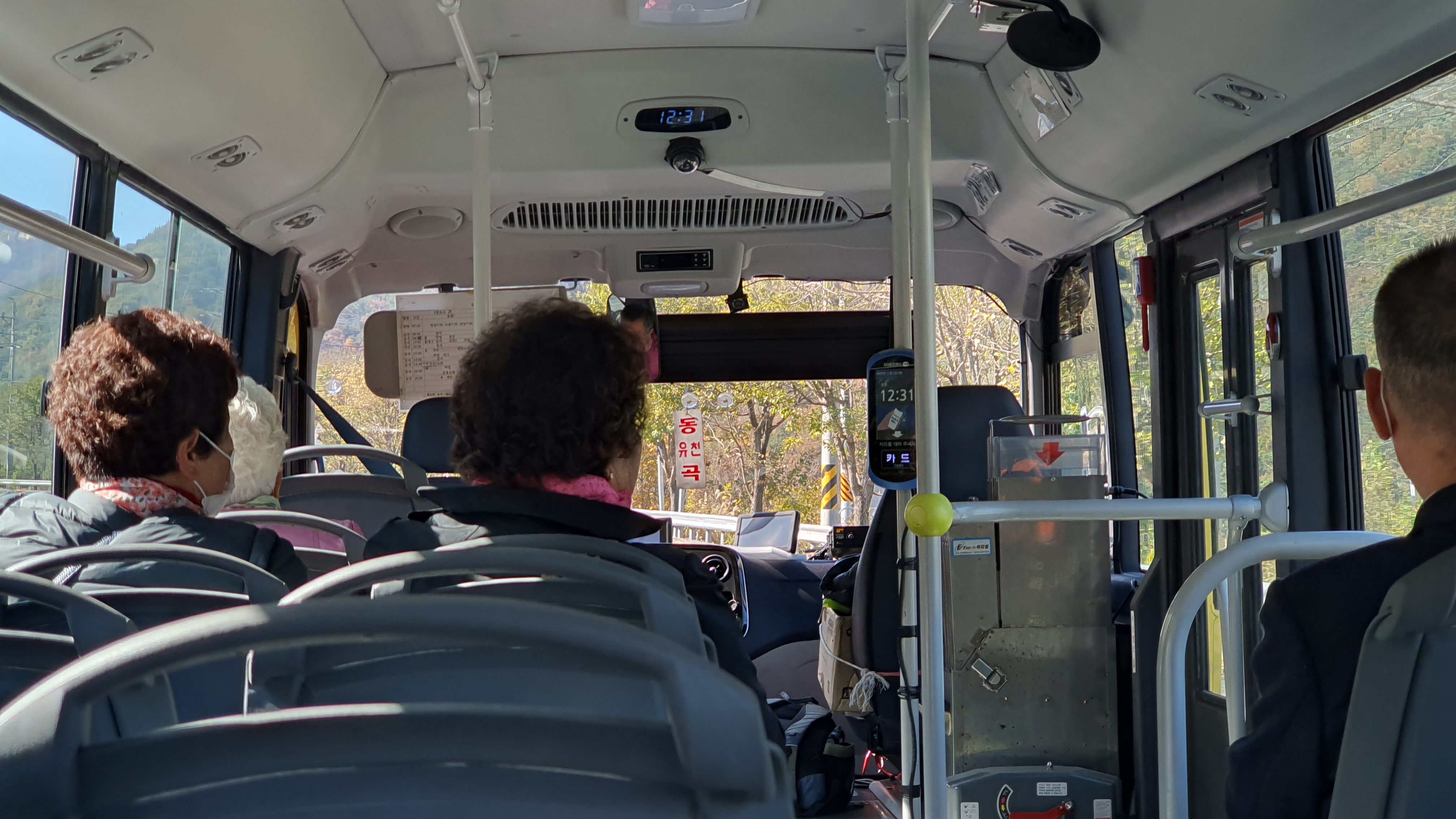 출발시간이 다 되어가니 기사아저씨께서 오셨고, 정류장 문이 잠겨 있어서 표를 끊을 수가 없는데 카드 대도 되냐고 양해를 구했습니다. 기사아저씨께서도 정류장 슈퍼 안에 사람이 아무도 없는 것을 보았었는지, 그렇게 하라며 바로 OK하시더군요(혹시 운문사 정류장 슈퍼가 폐업을 한 것은 아닐까 싶었지만 그렇지는 않고, 주인이 오늘은 가게를 비워서 그렇다고 합니다).