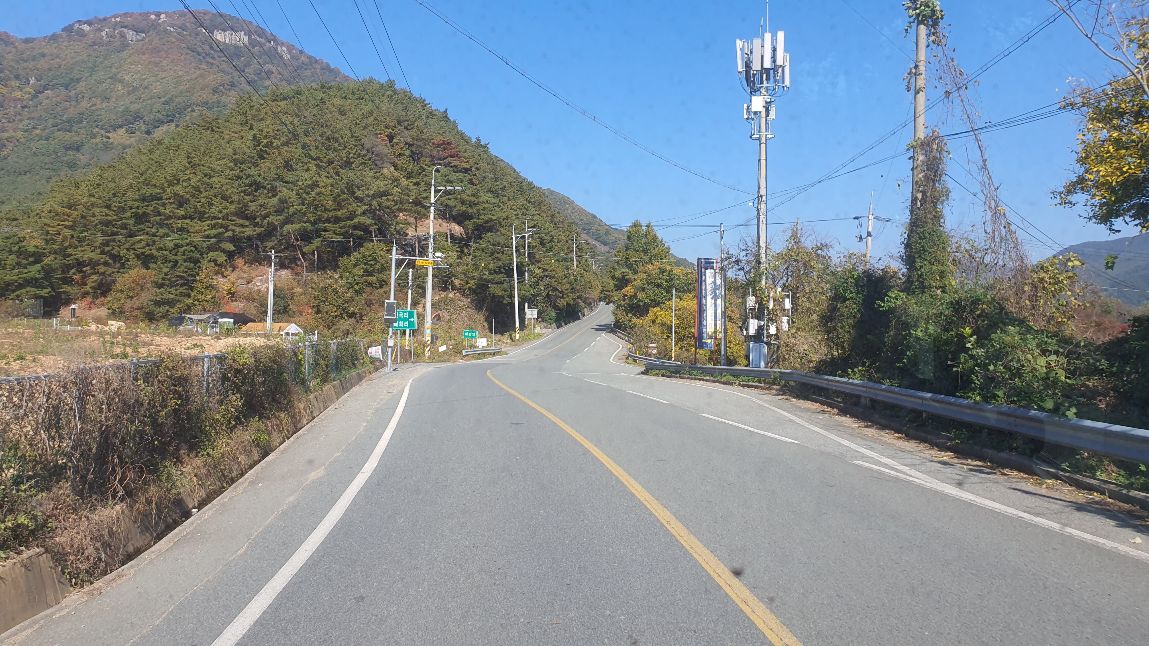 곰티 회차지를 나와 동곡 쪽으로 가니 두곡리로 들어가는 길이 보이고, 금천리 가는 길과 갈라지는 관하삼거리도 보였습니다. 이 삼거리가 바로 시간표에 나오는 "관하" 였는데, 또 언제가 될지 모르지만 이쪽 노선을 탈 때 참고가 될 것 같습니다. 관하삼거리에서 동곡 쪽으로 직진을 하니 상평리가 나오는데, 여기에서 버스가 좌회전을 하여 상평리 안으로 들어가주더군요. 상평리는 전부 왕복2차로이긴 했지만 주변은 온통 산뿐입니다. 강원도 산골짜기 보는 듯한 느낌도 들었고, 상평리와 돈치재터널을 지나는 동안 반대편에서 오는 차는 1대밖에 못 봤었다는 점에서 여기의 오지성 또한 체감이 됩니다. ㅋㅋ