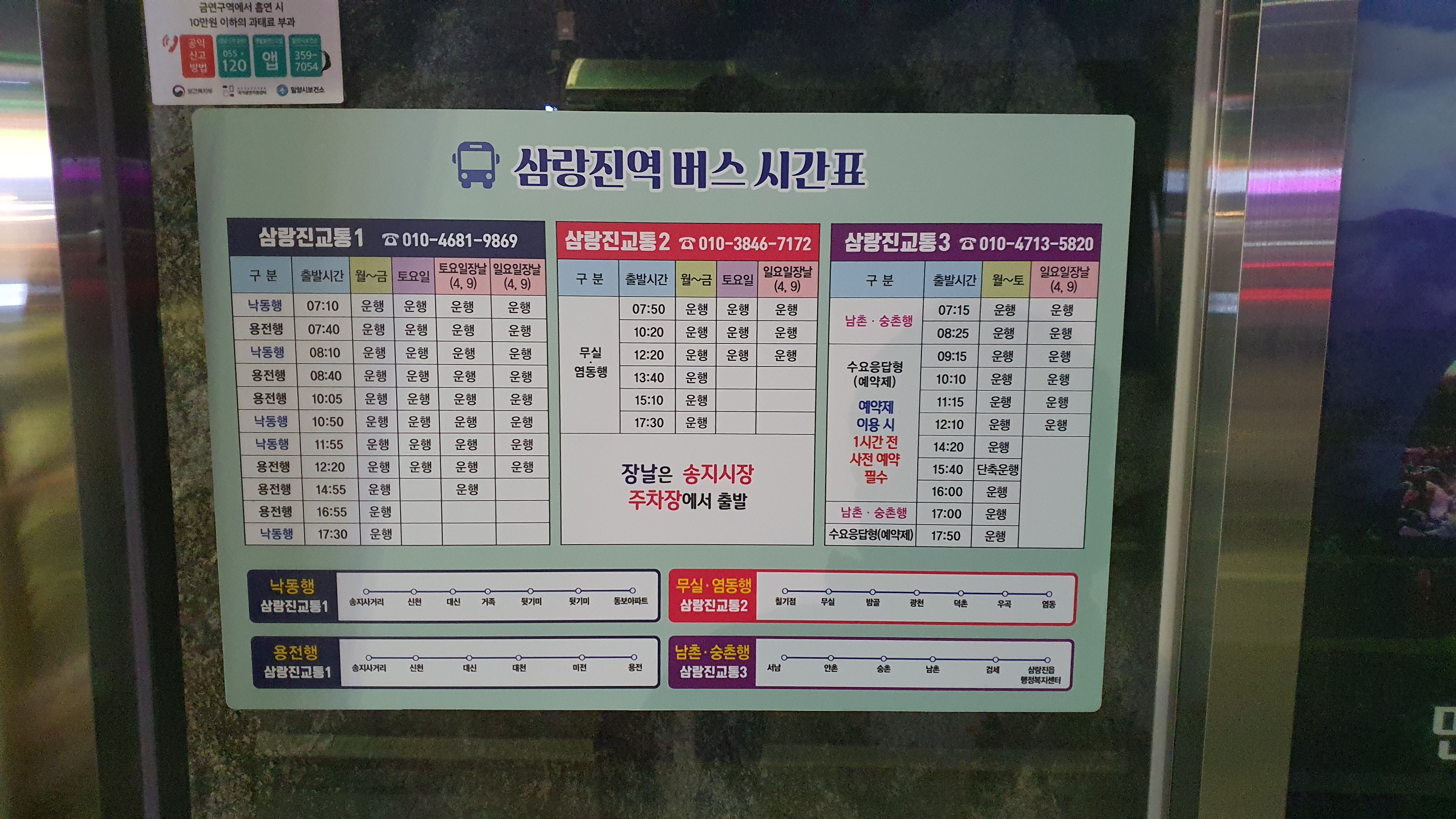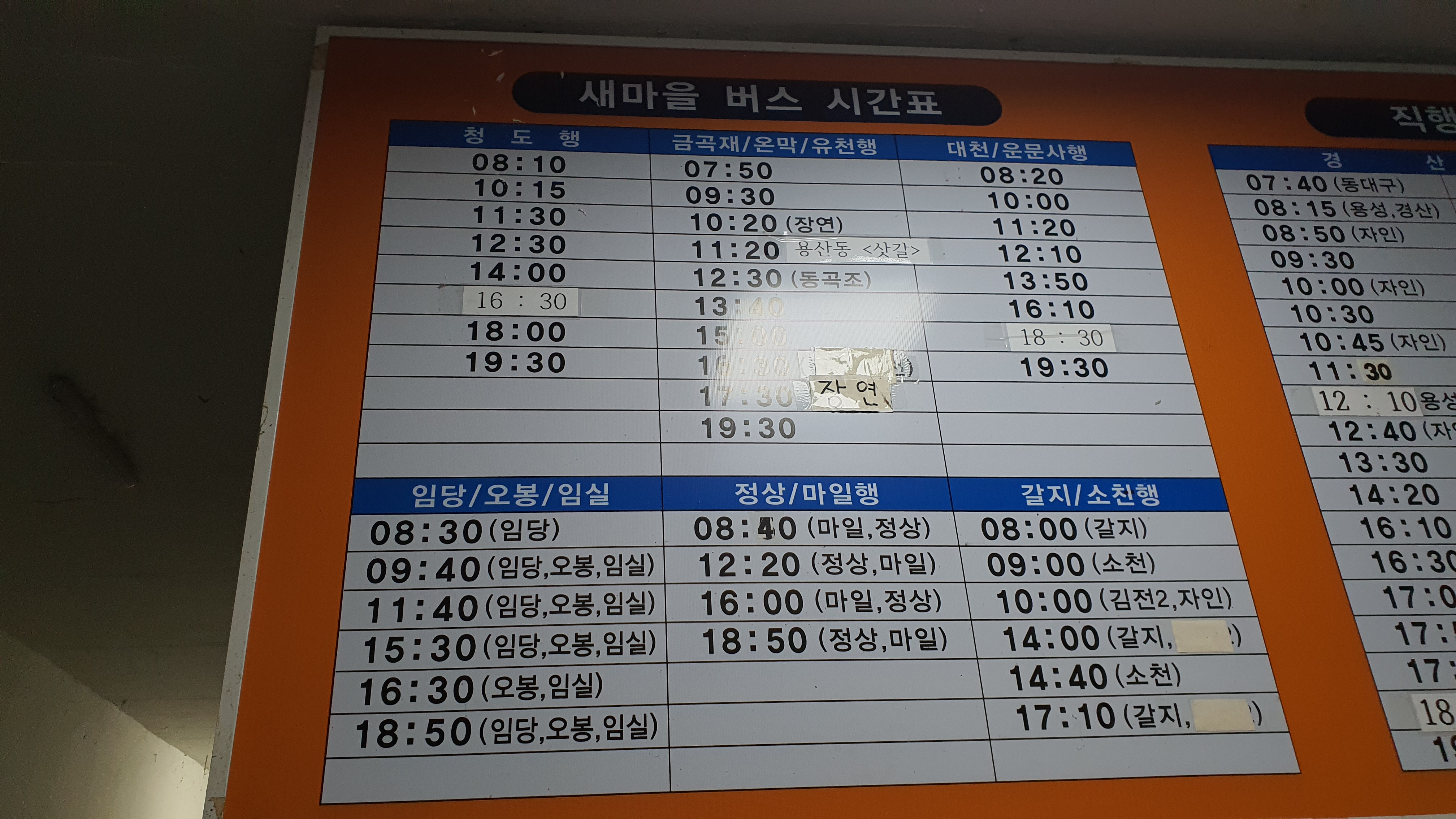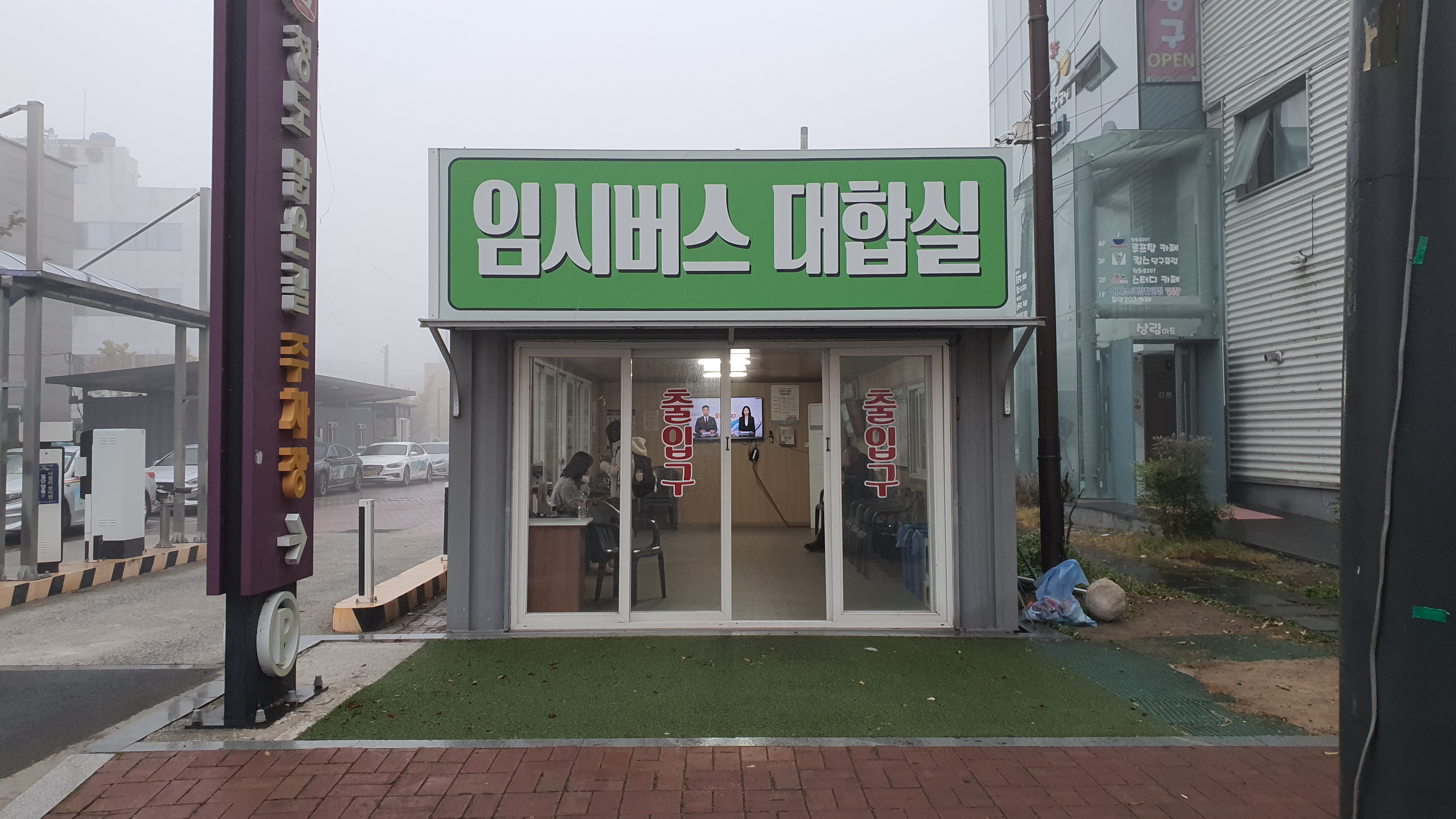 롯데리아 쪽으로 가보니 지도에서 보았던 것과 같이 임시 터미널이 있는 것이 보였고, 저는 시간표를 확인하며 동곡 가는 행복버스를 기다리게 되었습니다.