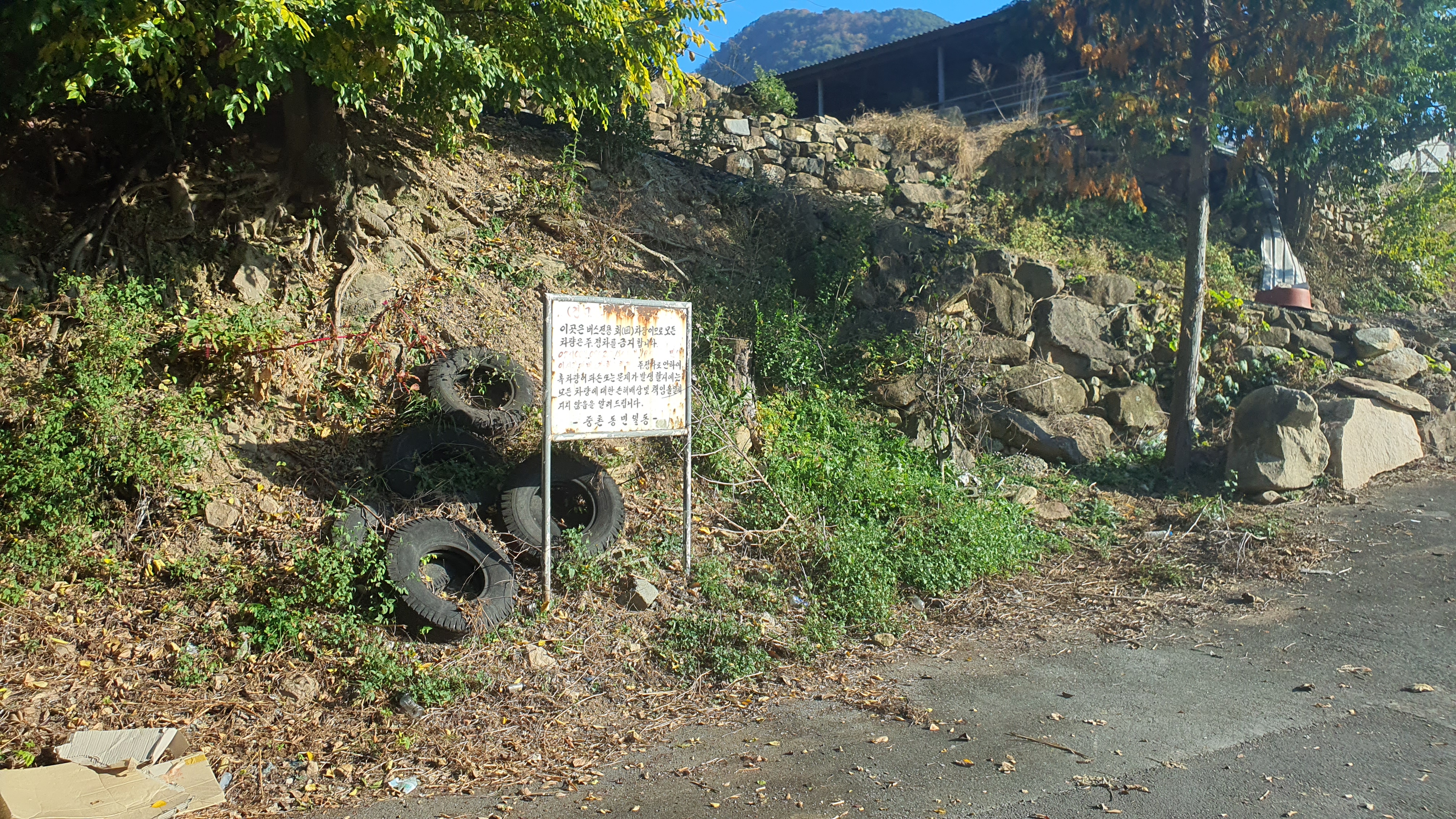 1차로로 좁아진 오르막길을 또 한참 올라가니 넓은 공터가 하나 나왔는데, 여기에도 정류장이 설치되어 있었습니다. 그것도 무려 지붕이 있는 버스정류장이었는데, 이렇게 깊고 험한 곳에도 이런 버스정류장이 있다니 살떨릴 따름입니다. 그런데 피네타마을이라고 써있던 이 정류장에서 회차할 줄 알았던 버스가 안으로 더 들어갑니다. 버스어플 및 포털사이트 지도에 나오는 숭촌 회차지는 여기인데, 도대체 얼마나 더 들어간다는 것인지???
