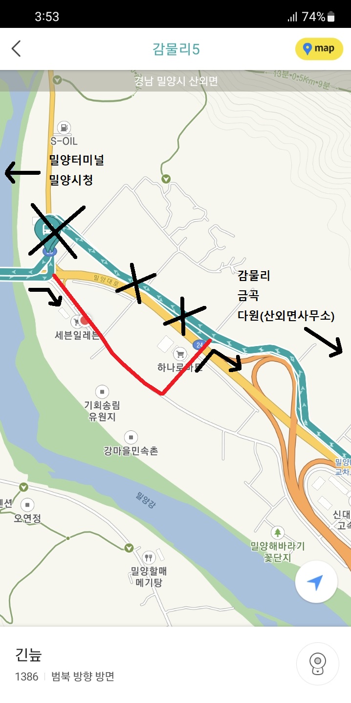 버스 안에는 사람들이 꽤 많이 타고 있었는데, 물론 어르신들이 대부분이었지만 40대 정도 되어보이는 분들도 어느정도 있더군요. 감물리 노선도 긴늪사거리 운행경로가 아까 발례 노선 및 엄광리 노선과 100% 똑같았는데, 산외면 방향으로 가는 노선들 모두가 이렇게 갈 것임을 다시 한 번 예상할 수 있었습니다.