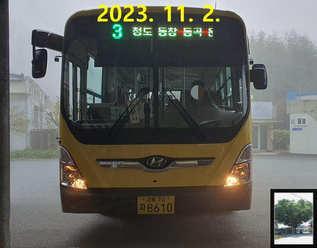 오전 11시 39분이 되니 군내버스가 도착합니다. 청도군내버스는 과속을 하기보다는 군청 홈페이지 시간표에 맞춰 안정적으로 다니는 경향이 있는 듯했는데, 그걸 고려해도 차가 상당히 빨리 오더군요.
