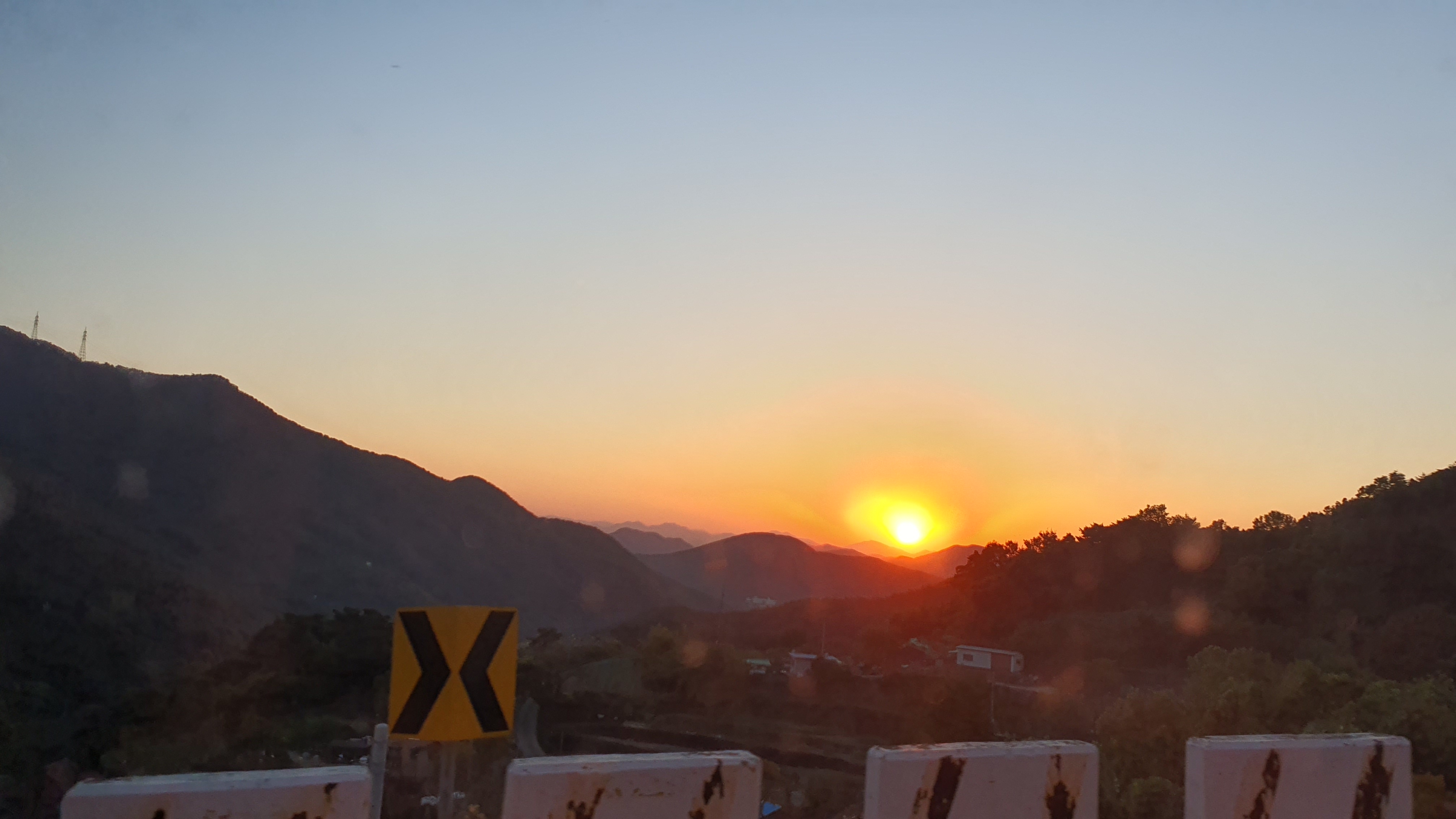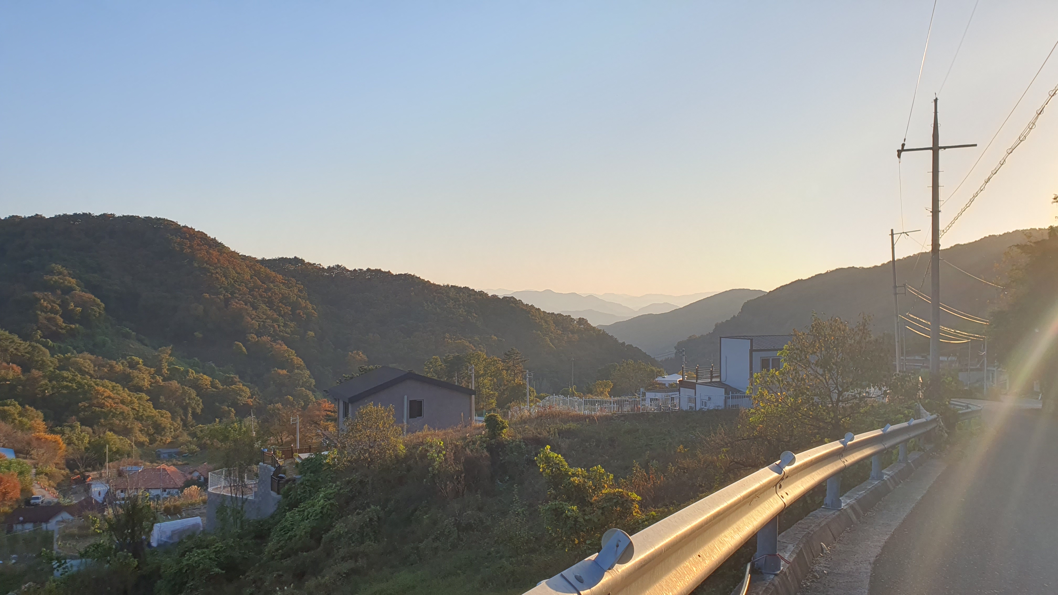 이 험한 고갯길을 5분 남짓 올라가니 안촌마을이 나오는데, 왼쪽 차창을 본 저는 놀람과 동시에 감탄을 하게 되었습니다. 하도 높은 곳이다보니 수많은 산봉우리들이 아래에 쫙 깔려 있었고, 땅은 어디로 갔는지 도무지 보이질 않았던 겁니다. 또한 산봉우리들 사이로 저녁노을과 함께 해가 지는 모습도 보이는데, 진짜 절경이 따로 없습니다.