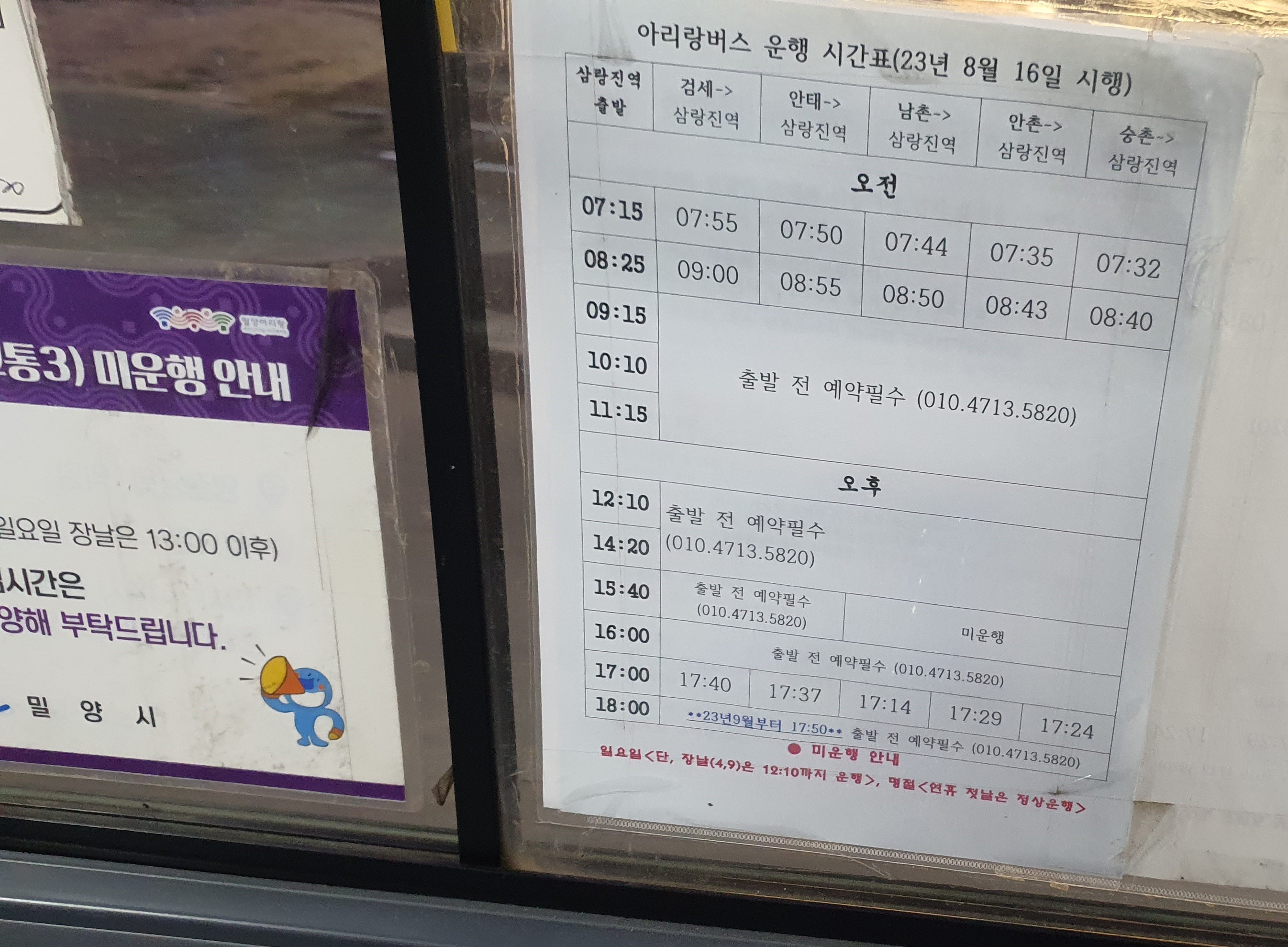 그런데 이게 참 어떻게 된 것인지 버스가 올 때가 지났는데도 4-1번만 이따금씩 보일 뿐, 아리랑버스는 코빼기도 보이지 않는 것이었습니다. 밀양교통은 결코 느린 회사가 아닌데???? 이상한 느낌에 시간표를 확인해보니, 아차;;; 위양지로 가는 아리랑버스는 주말 및 공휴일에만 운행하는 노선이었더군요. 어쩐지 차가 너무 안 오는 게 이상하다 했습니다. -ㅅ-;;;