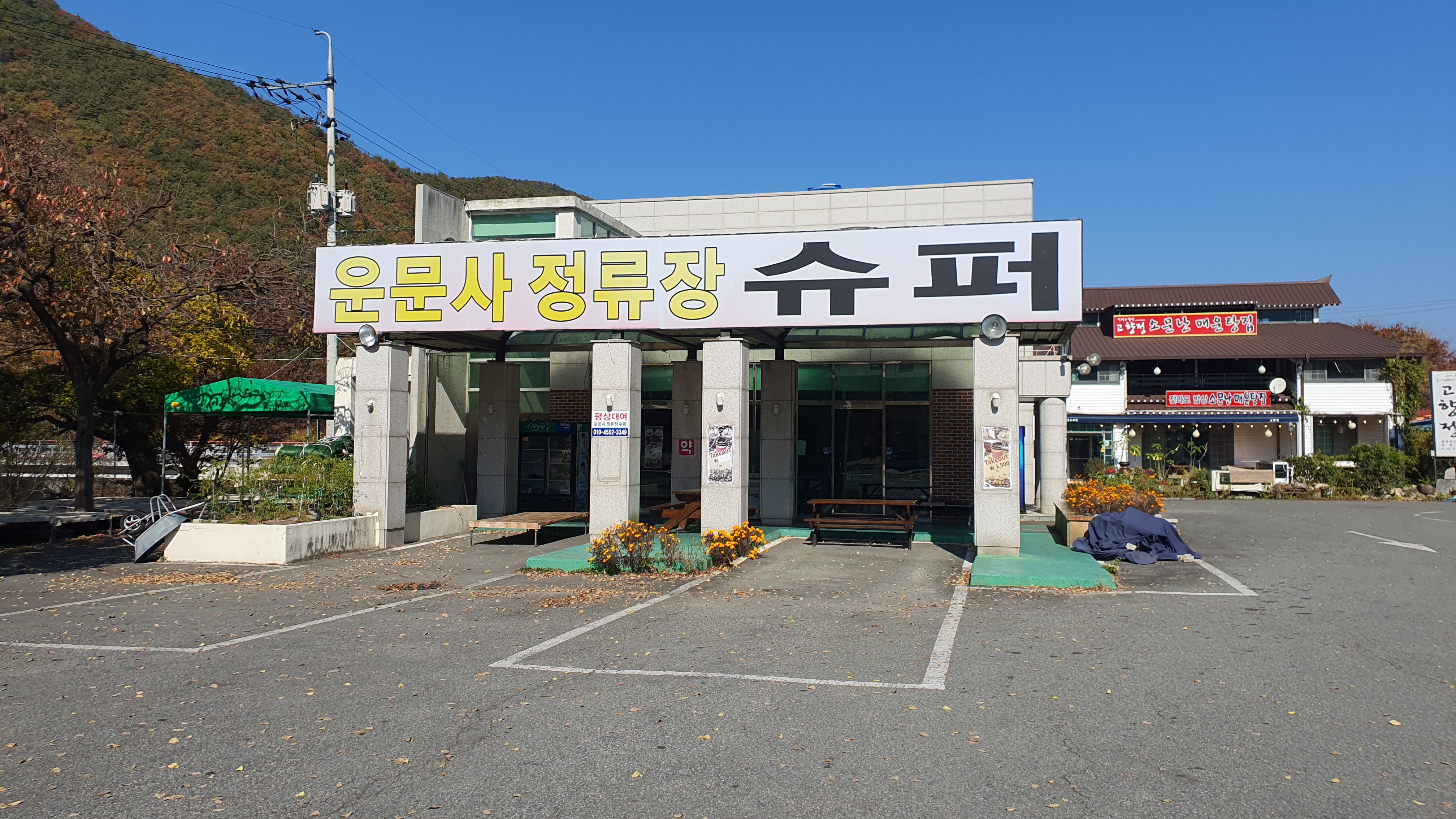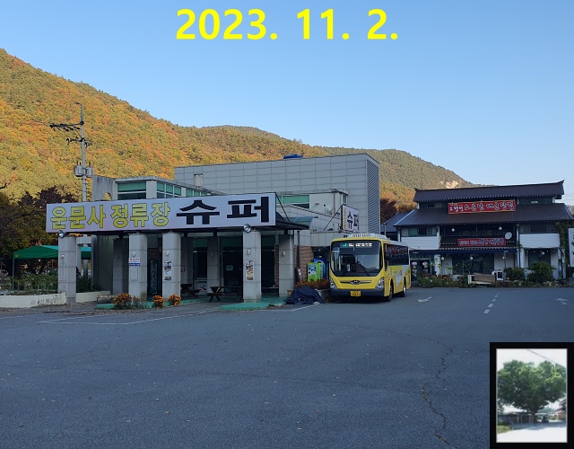 왕복2차로 도로를 따라 안으로 들어가니 민박집과 식당들이 보이기 시작했고, 버스는 오전 8시 40분에 운문사 종점 주차장에서 회차합니다. 사진으로 보았던 운문사정류장 슈퍼 간판은 그대로더군요.