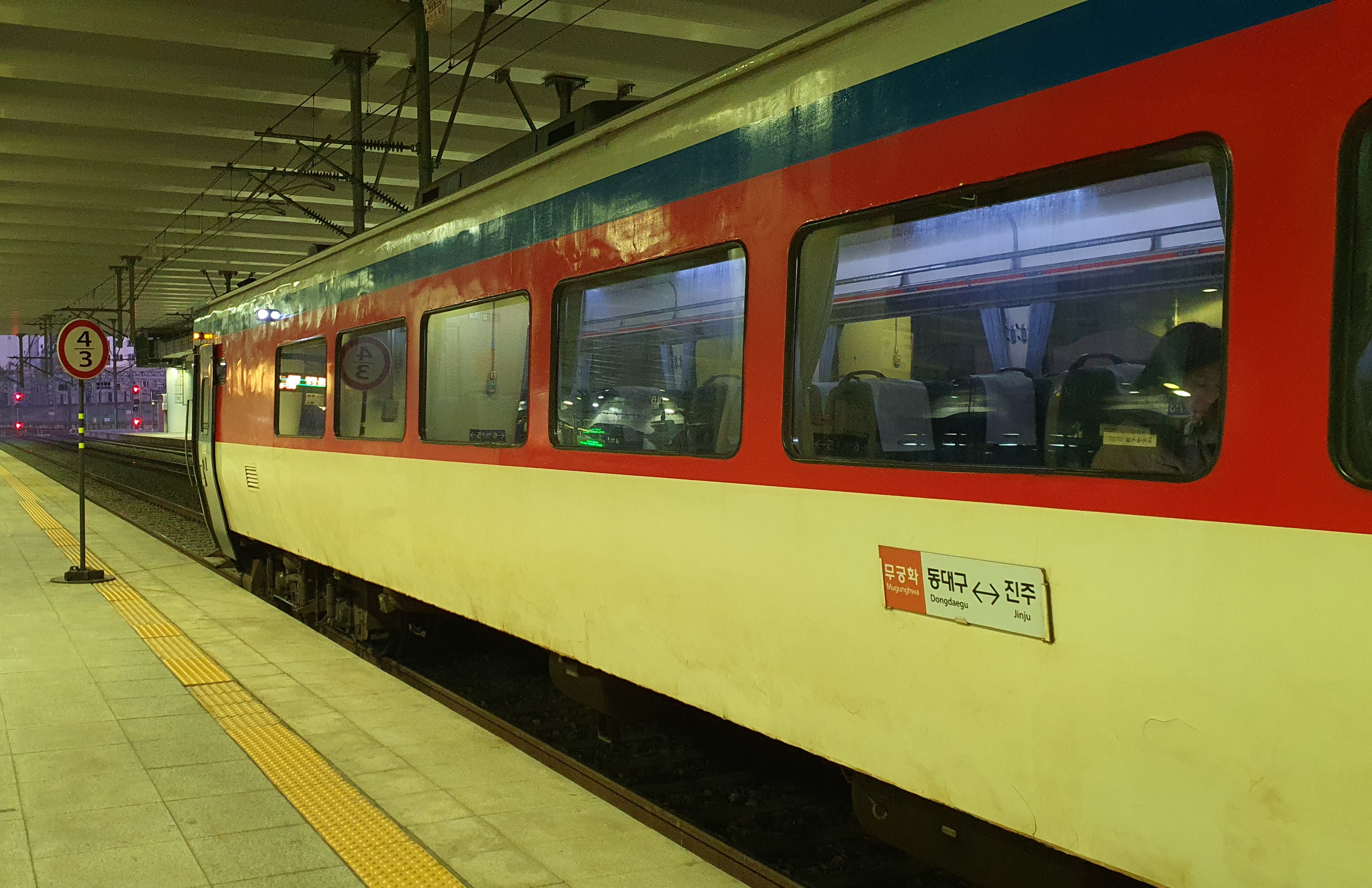 스토리웨이에서 물을 사고 화장실도 다녀온 다음 부산방향 승강장으로 가보니 무궁화호 열차 하나가 서 있었습니다. 기관차에 시동이 걸려있는지 특유의 찡~ 하는 소리가 들리는데, 이게 오전 6시 40분에 출발하는 기차겠구나 싶더군요. 수도권 및 충청도, 대전 거주자의 경우 대구에서 1박을 하지 않으면 탈 방법이 없을 정도로 이른 시간에 출발하는 열차라(※) 빈 좌석이 많이 보였지만, 사람 몇 명이 이미 타고 있어서 저도 열차 안으로 들어가 자리에 앉았습니다.