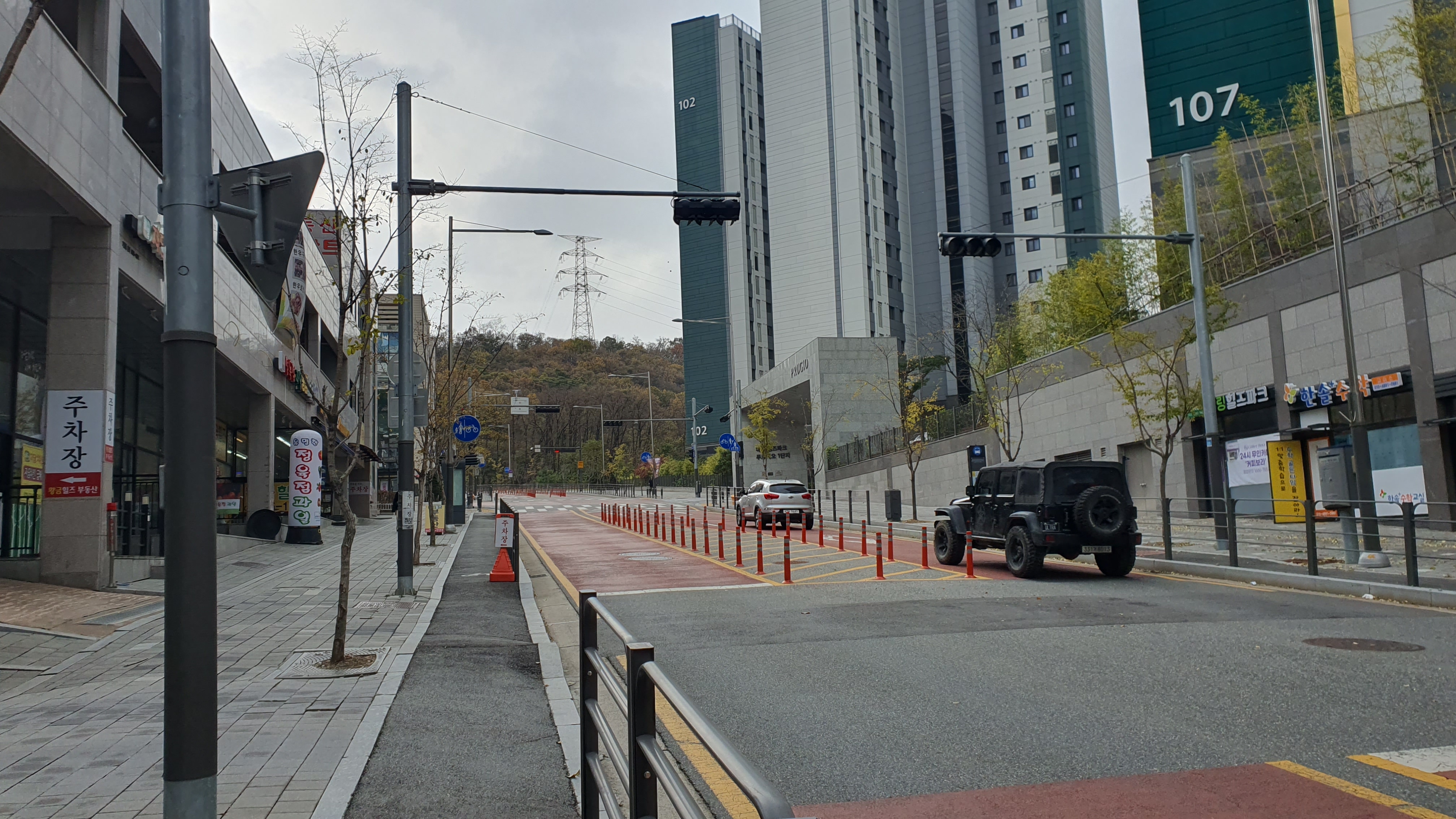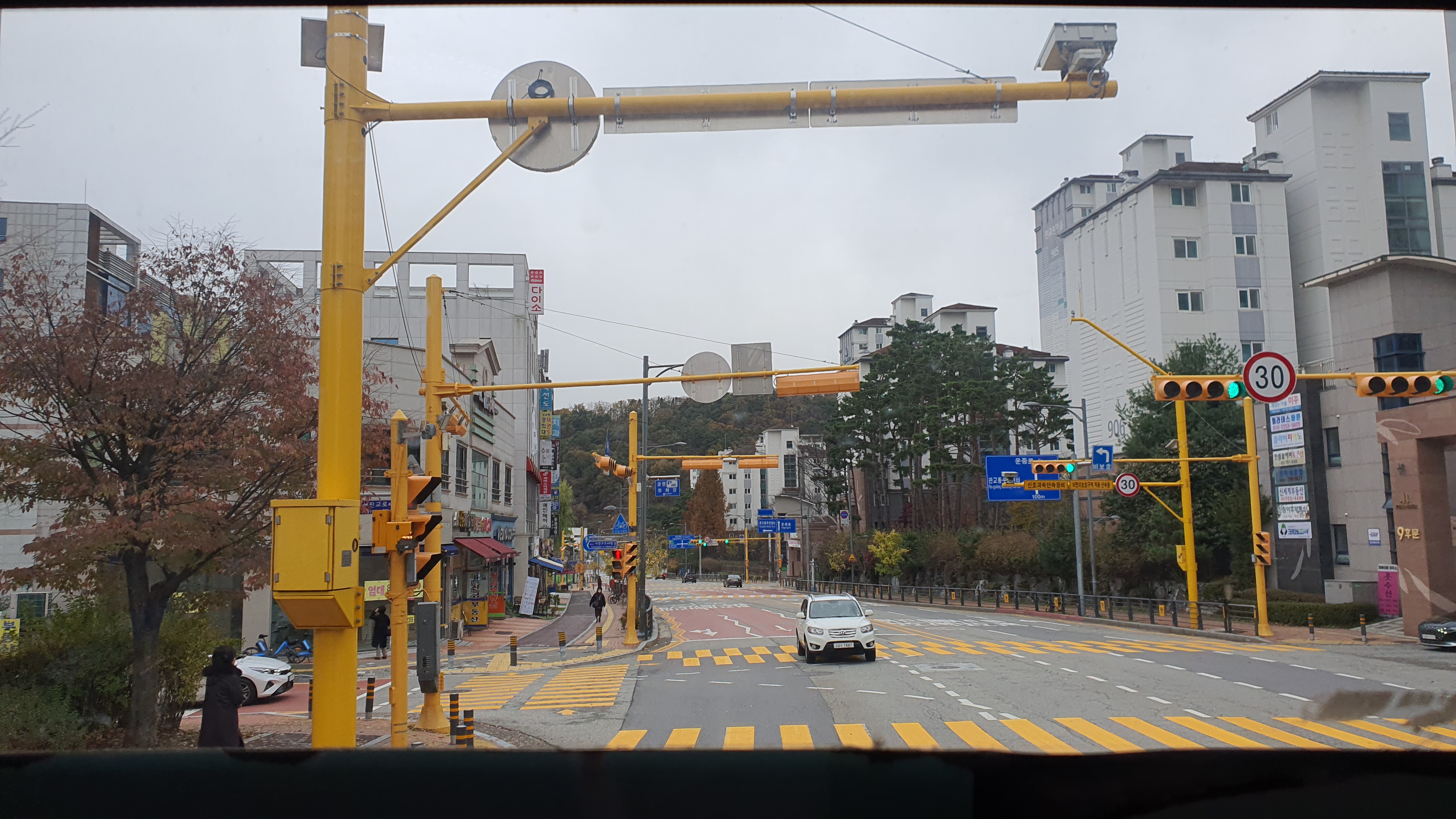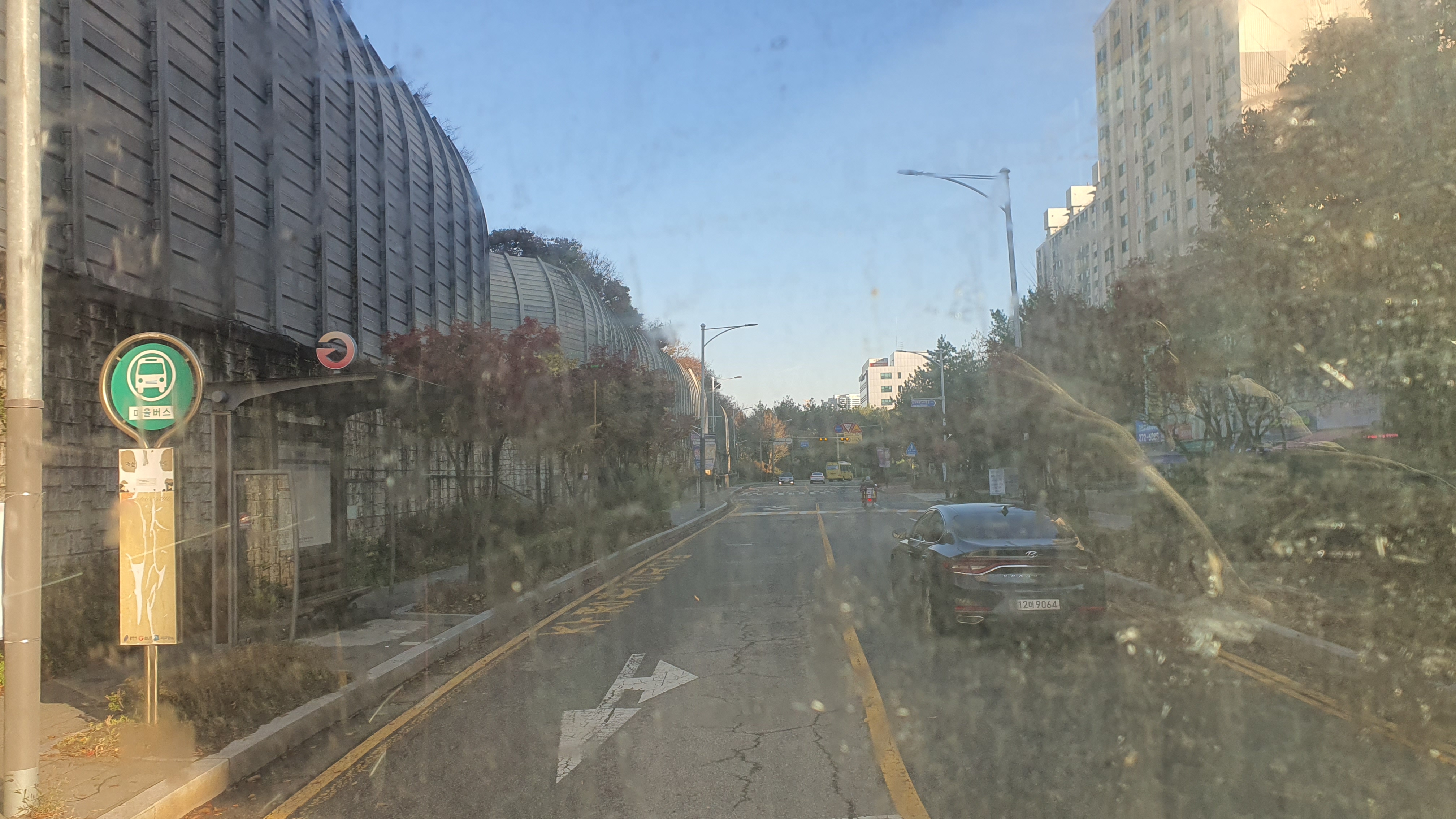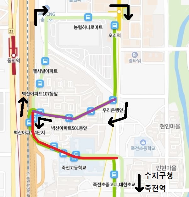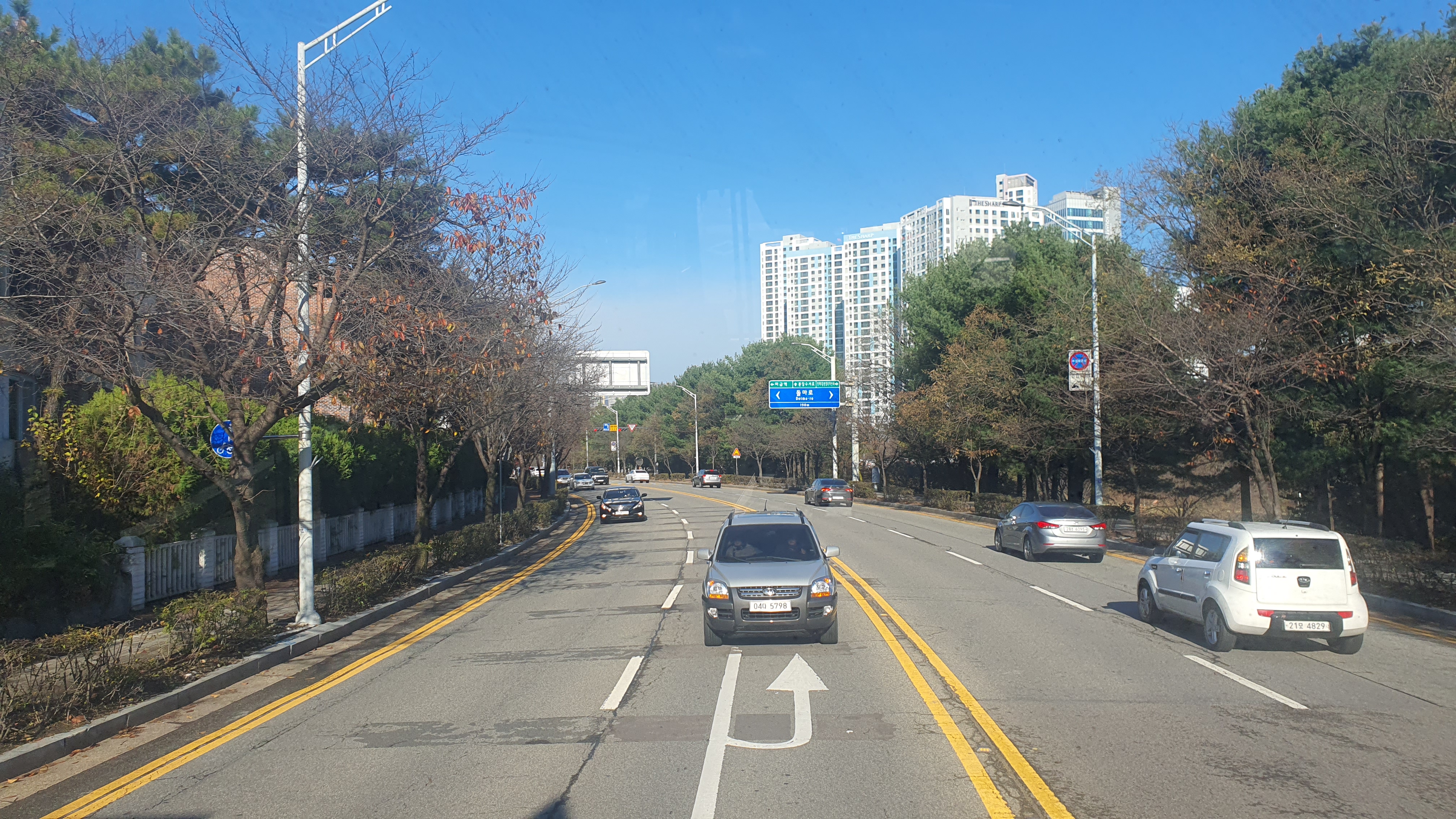 저와 손님 한 명을 태운 버스는 곧바로 오리역을 출발하였고, 바로 나오는 사거리에서 직진할 듯 하다가 따로 나 있는 좁은 길쪽으로 우회전을 합니다. 여기는 평일에만 다니는 이 버스의 단독 구간이라는 사실이 참 그렇긴 하지만, 용구대로에서 멀지 않은 곳이라서 큰 문제로 번지지는 않았을 거라는 생각이 듭니다. 이 노선이 죽전중학교와 죽전고등학교, 그리고 대현초등학교까지 무려 3개의 학교를 지나는데도 말이죠.