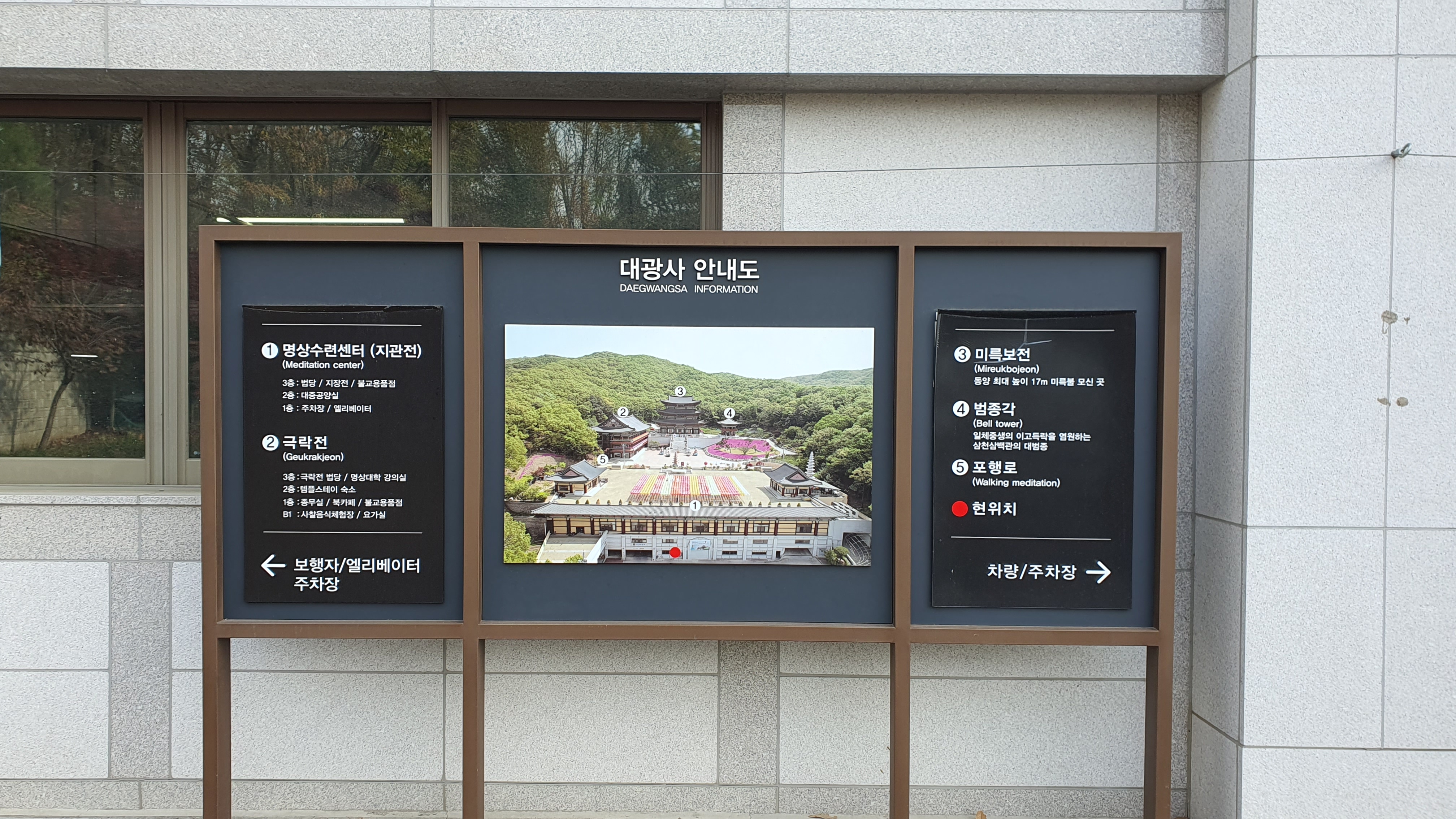 그런데 버스 시간이 남아서 부처님께 잠시 인사도 드릴 겸 절 구경을 해보려고 했더니, 여기는 들어가는 길이 좀 이상합니다. 주차장에서 엘리베이터를 타고 올라가면 대웅전이 있는 경내로 이어지는 층이 나올 것 같은데 정작 경내로 가는 길은 보이질 않았던 겁니다. 결국 저는 마침 엘리베이터 안에 붙어 있던 버스 시간표를 보고 화장실만 다녀온 다음, 대광사 주차장 바로 앞에서 버스를 기다릴 수밖에 없었습니다.