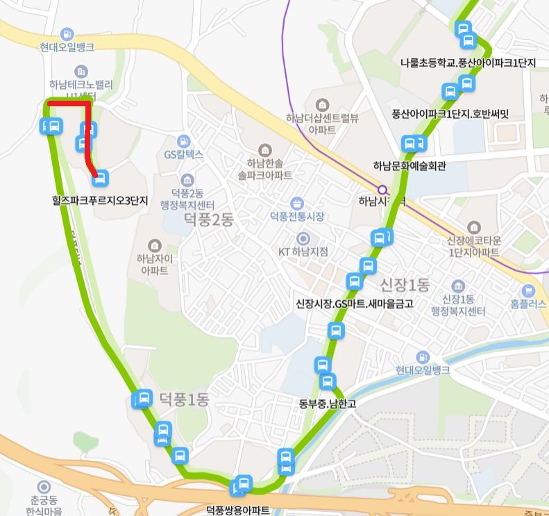 물론 하남요양병원 앞길은 하남 1번 마을버스나 30-3번으로도 커버가 되기 때문에, 오늘 이 길을 가보지 못한다고 하여 타격이 되는 것은 아니었습니다. 또한 오늘은 엄미리 노선(15-2)을 타는 것이 중요하기 때문에 바깥을 보는 데에 집중을 하게 됩니다.