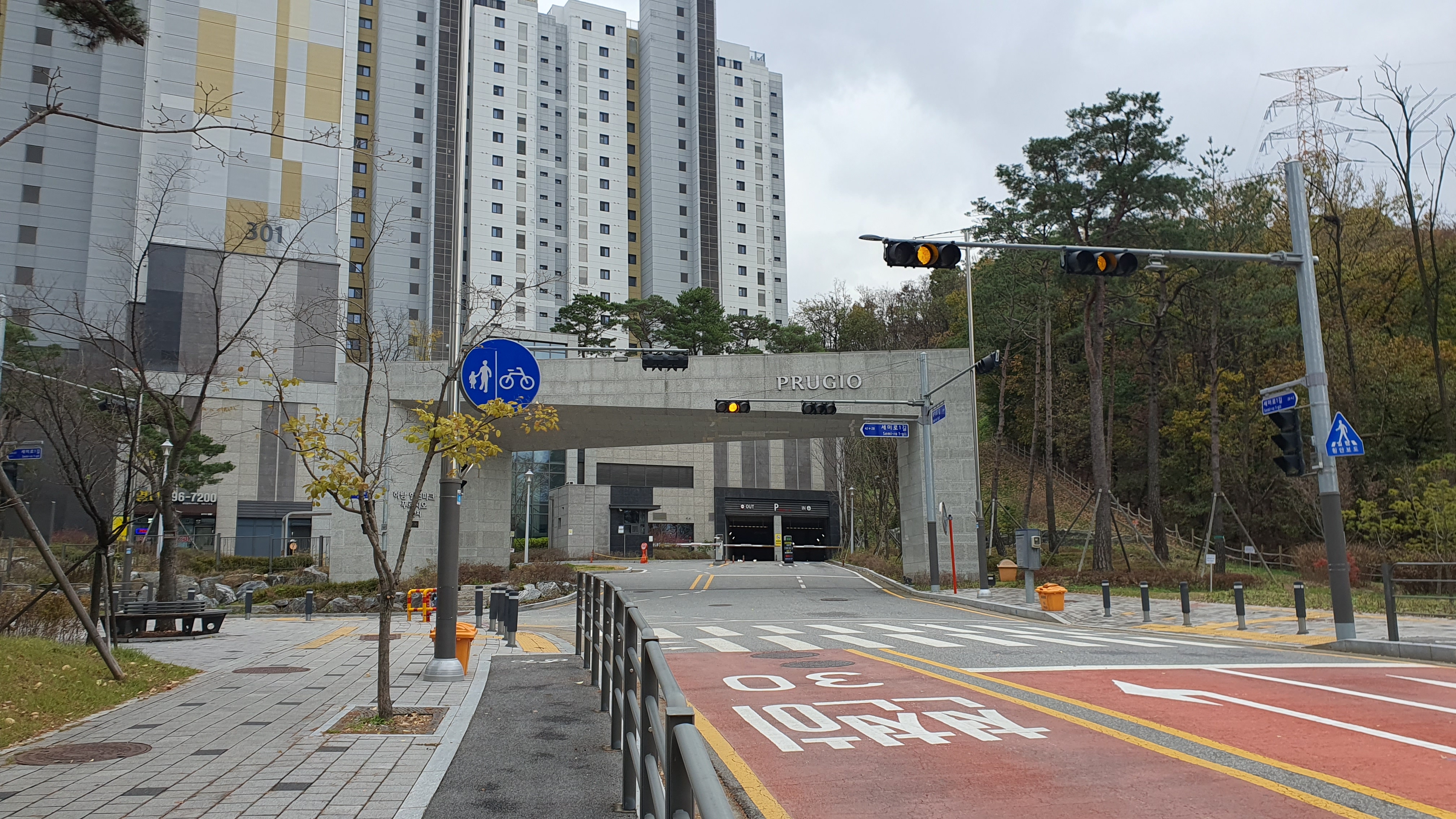 오르막을 지나니 곧 아파트 단지가 나오는데, 지도에는 단지 내 도로가 나오지 않지만 정말로 통행로가 없을 수는 없기에 아파트 단지를 가로질러 힐즈파크푸르지오3단지 종점을 향해 갑니다. 단지 내부의 통행로를 이용하니 단 10분만에 버스종점에 도착할 수 있었는데, 여기는 완전 막다른 길끝이라 버스가 어떻게 회차할 지 아주 쉽게 예상이 가능했습니다.