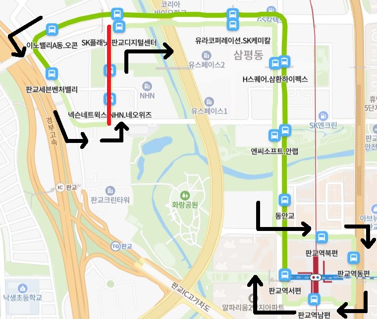 버스는 아기자기한 맛이 있던 판교원마을을 지나 단 10분만에 SK플래닛에 저를 내려줍니다. 66번을 타지는 못했지만 코스가 뻐그러지지 않았다는 것에 안도하게 되었죠.