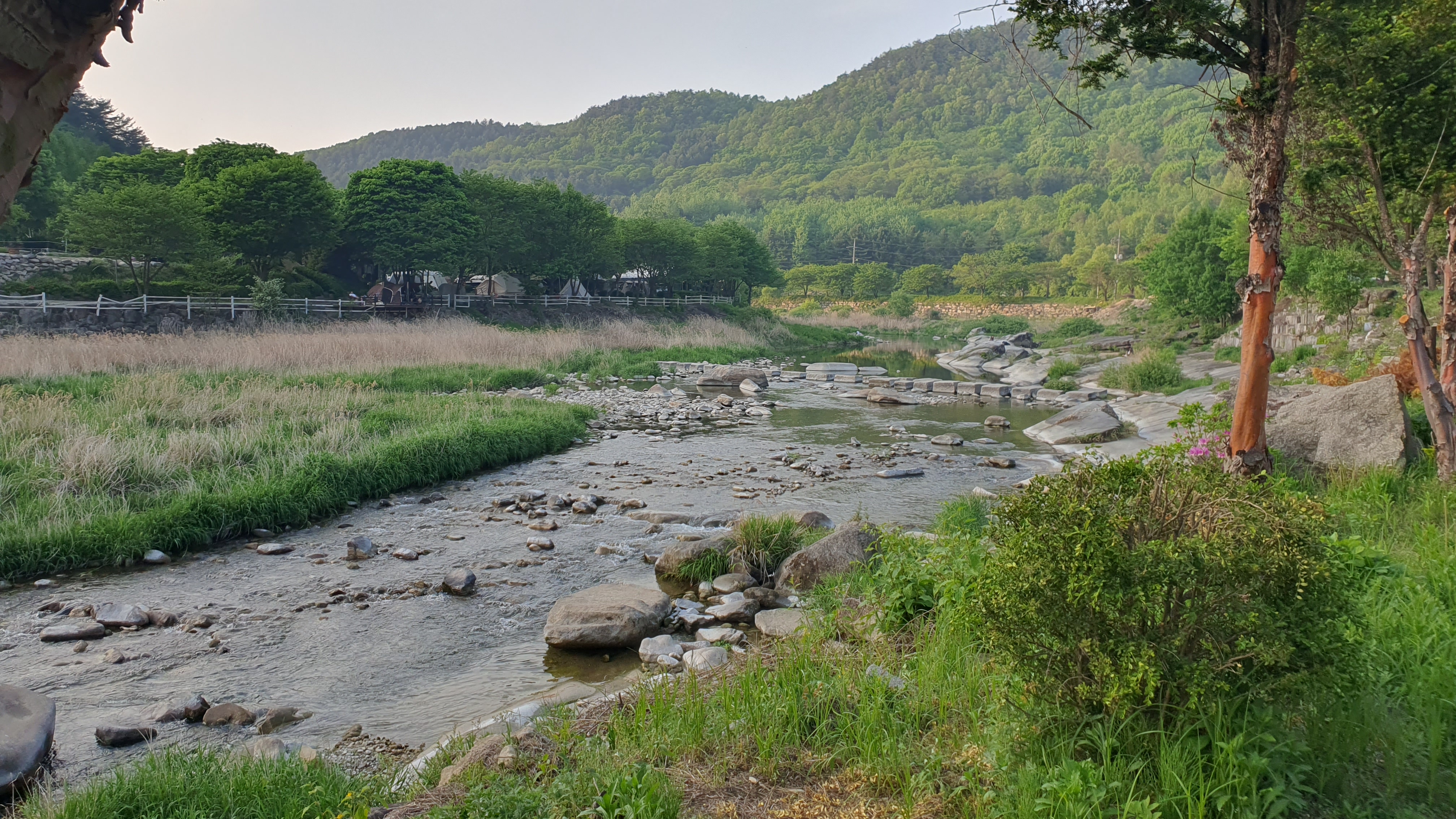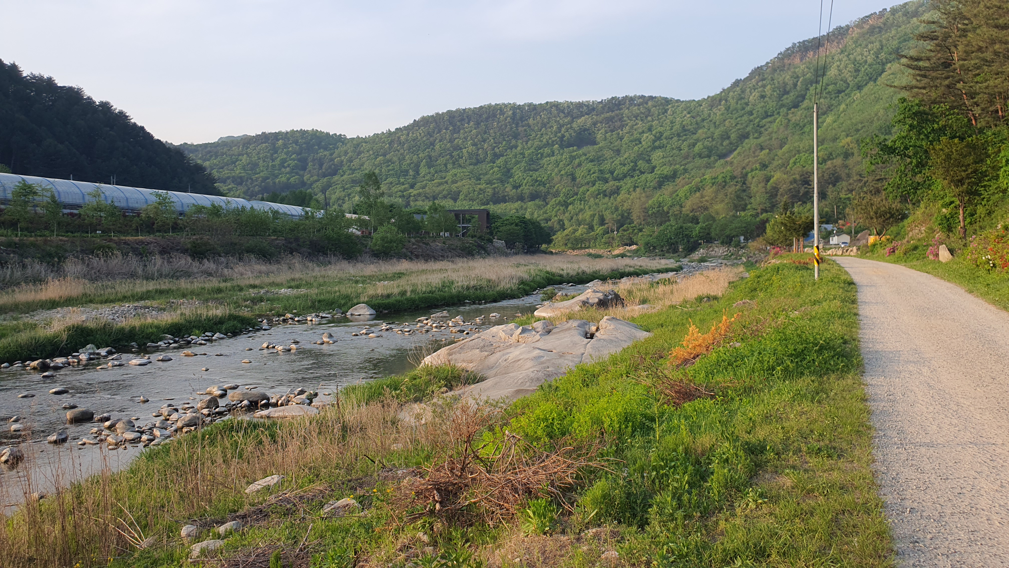 버스는 오전 11시에 다시 나가기 때문에 저는 왔던 길 따라 여유있게 걸어나가봅니다. 마홀수영장 앞을 흐르는 포천천이 참 멋지더군요. 포청천을 포천천으로 잘못 쓴 것이 아니다