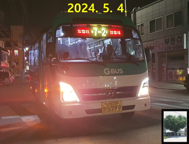 도평리차고지는 차고지 불빛만 있어서 차고지 입구 주변을 제외하면 엄청나게 어두워도 이상하지 않을 수준이었지만, 그나마 차고지 주변에 가게가 2군데 정도가 있어 이것 때문에 생각보다는 밝은 편이더군요. 석준형과 굴업리에서 막차를 타고 용문으로 나왔을 때와 비슷한 수준이었습니다. 오후 7시 58분이 되어 와수리로 올라가는 직행이 건너편에 도착하여 사람 1명을 태우고 가는 모습을 보고 있으니 오후 8시가 다 되어가자 차고지에서 7-2번 카운티 한 대가 모습을 드러냅니다.