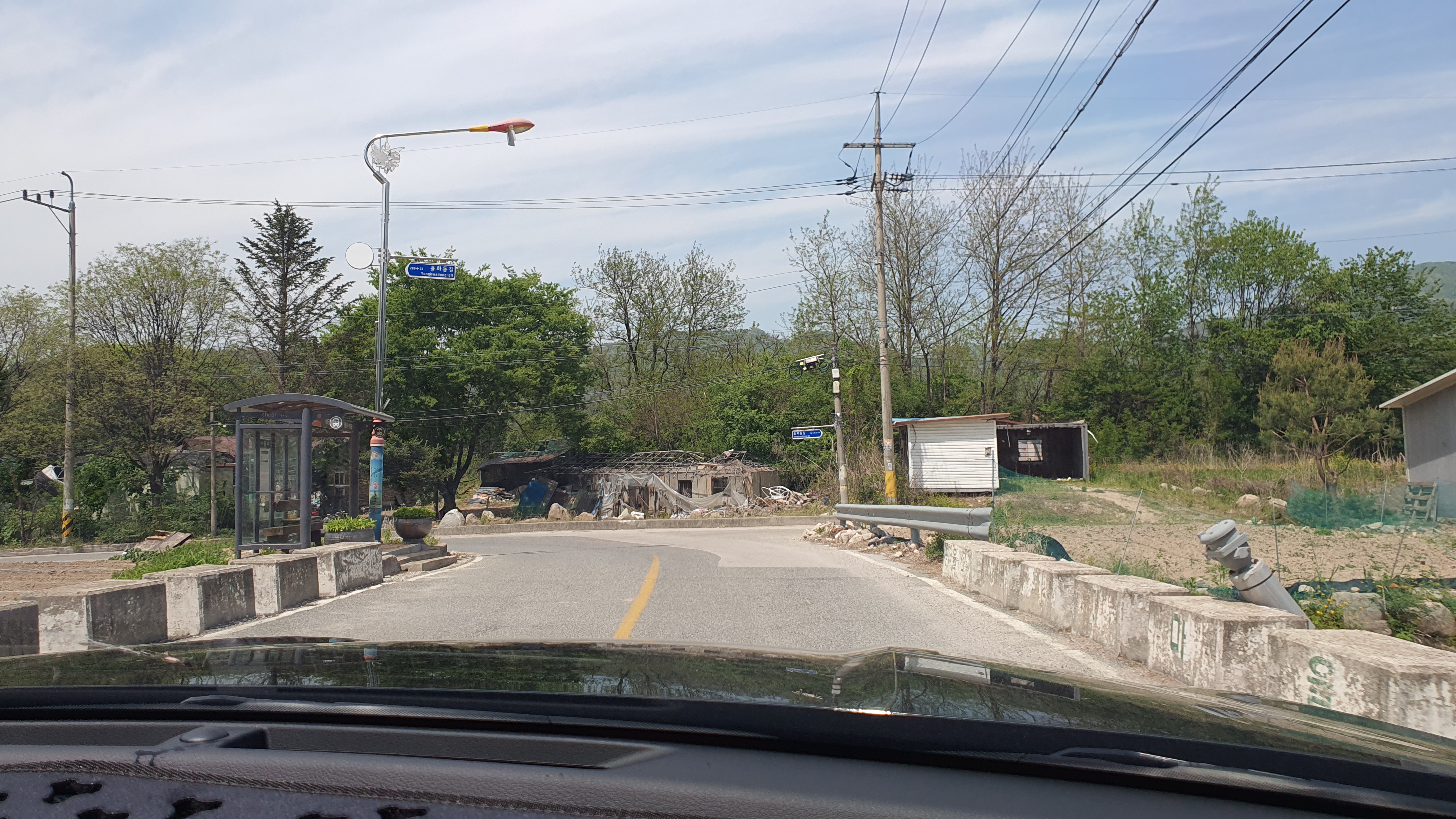 와수리 시가지를 벗어난 버스는 저번처럼 와수5리 마을회관 앞을 지나긴 합니다만, 이번에는 회관 앞에서 우회전을 하여 육단리를 향해 달려줍니다. 도로 주변으로 보이는 산과 함께 차창 왼쪽으로 흐르던 작은 하천을 보고 있으니 육단리는 10분도 안 되어 도착합니다.