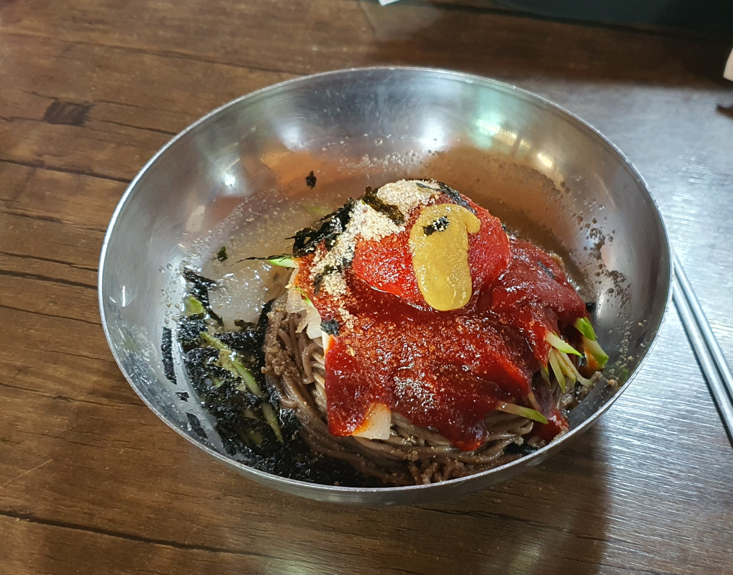 결국 저는 다른 식당을 찾아 막국수를 먹게 되었습니다. 먹을만한 게 마땅히 없어 찾게 된 식당이었고 막국수도 그냥 평균 수준이었지만, 정말 웬만해선 뭐든지 잘 먹는 저조차도 도저히 먹을 수 없을 정도로 정신나간 폭탄 수준이 아니었다는 점, 버스시간 때문에 10분 먹방을 할 필요가 없었다는 점은 정말 감사할 일이었습니다.