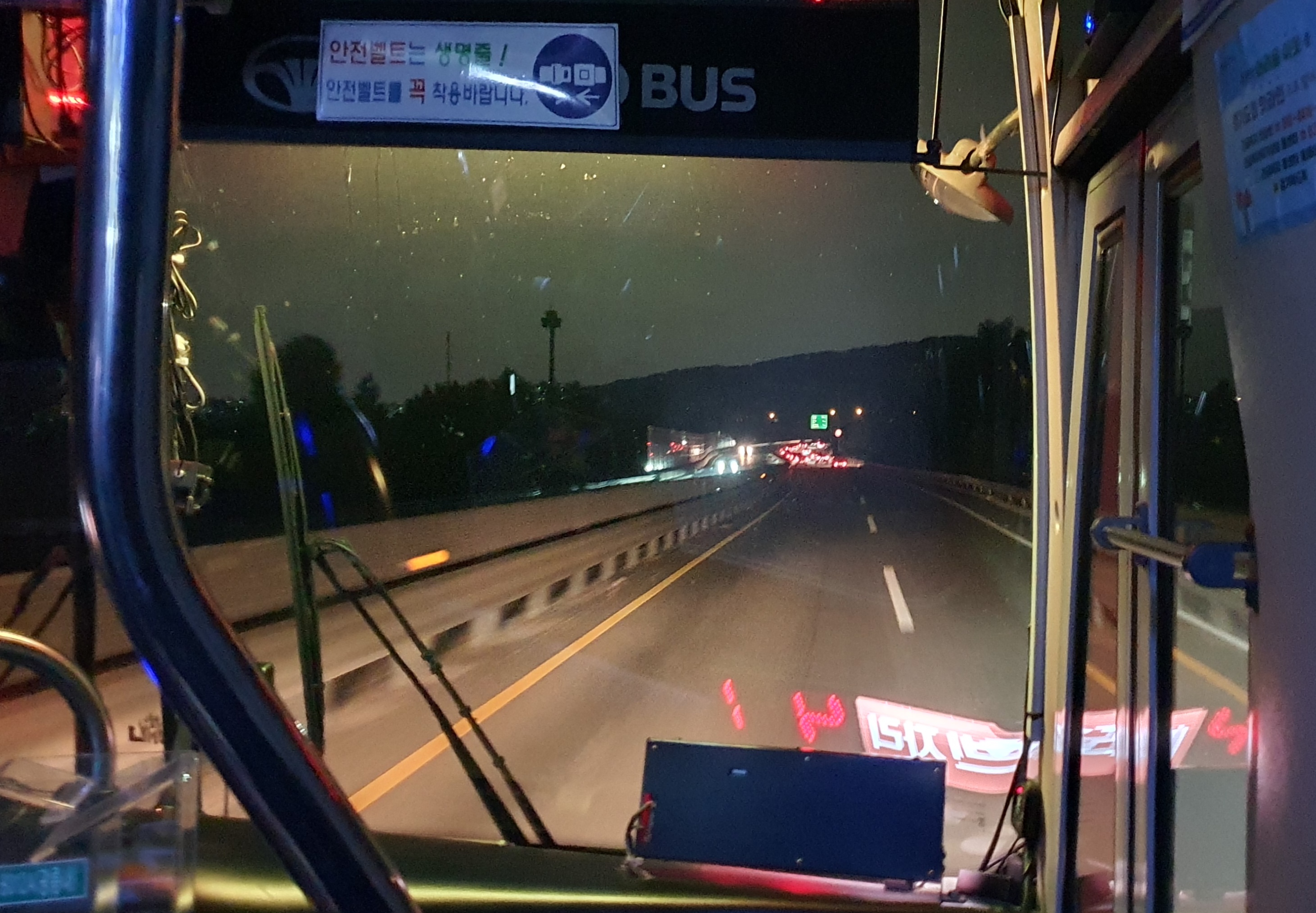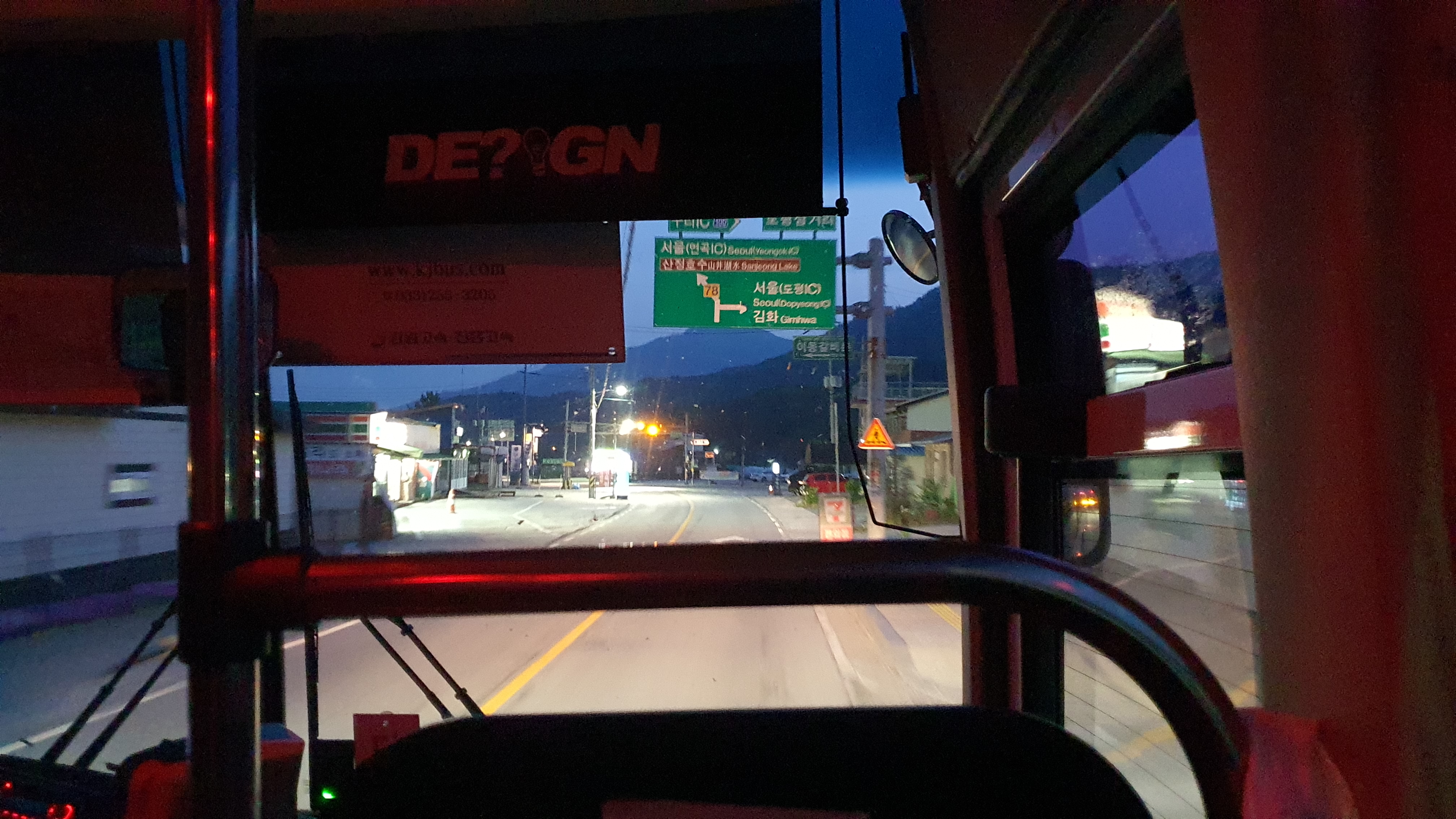 오후 7시 20분이 되자 버스는 출발했고, 이번에도 출발한 지 3분 가량 지나니 시가지는 시야에서 사라지게 되었습니다. 광덕고개를 향해 버스가 달리는데 도로변에는 요금표에 나온 장소 외에도 정류장들이 세워져 있는 것이 보이더군요. 그런데 광덕2리에서도 손님이 타는 걸 보니 요금표에 없는 정류장 또한 모두 정차한다는 걸 알 수 있었습니다. 사실 여기는 시외버스가 간선, 군내버스가 지선 역할을 하는데, 군내버스의 운행횟수가 많지 않으니 시외버스도 정류장마다 정차하겠다는 걸 짐작할 수는 있었지만 의외로 시골로 들어가는 완행 시외버스는 진입장벽이 높아서 사전정보가 많지 않은 것이 현실이었죠.