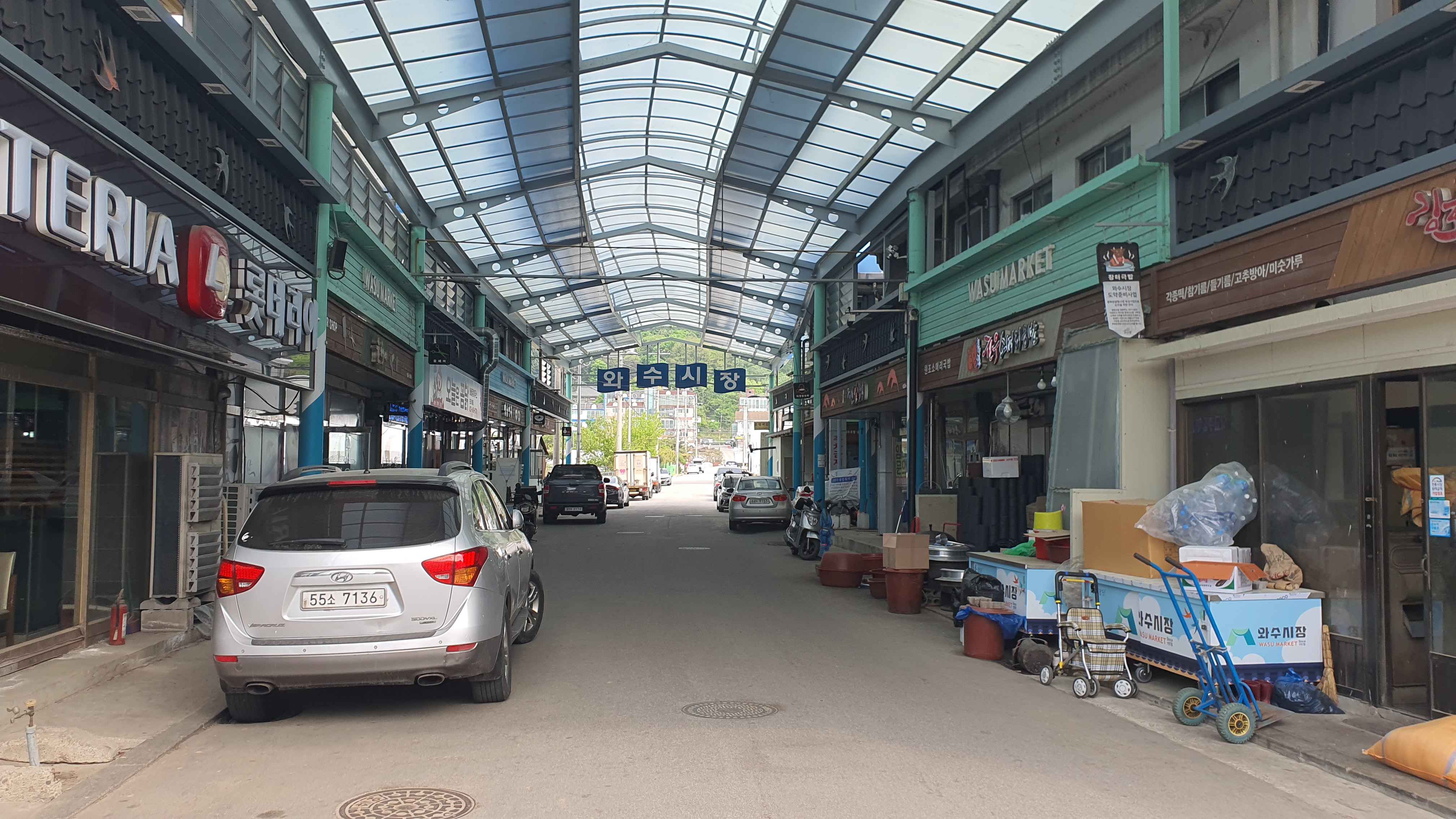 그래도 시골은 시골이라고, 와수리 차고지 근처에 이르니 "여기는 시가지 어귀입니다"라고 말해주는 듯 가게가 적어지기 시작하는 것을 볼 수 있었습니다. 저번에 보았듯 와수리 차고지로 가기 직전에 삼거리가 하나 있었는데, 삼거리 왼쪽을 보니 아까 제가 타고 왔던 버스가 왕복2차선 바로 옆 공터에 주차가 되어 있네요.