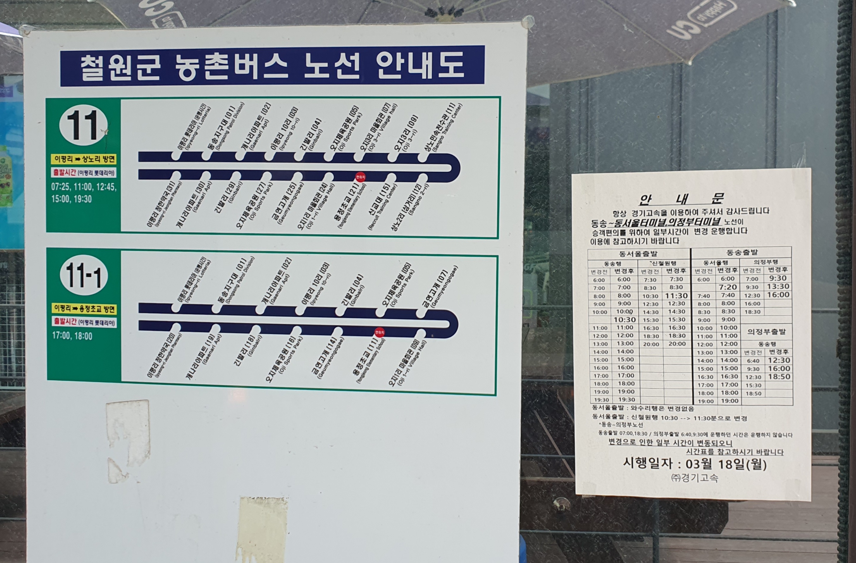 동송에 도착한 제가 타게 된 버스는 오지3리 순환노선(11)입니다. 관인으로 가는 포천 60-1번의 어이없는 저속 운행으로 끝내 타보지 못했던 그 노선이기도 한데(2022년 5월 28일 시승기 참고), 이 오지3리 노선은 오후 3시 이후로는 마을 안으로 들어가질 않고 동송과 상노1리 왕복만 하는(11-1) 어이없는 운행 형태를 보이는지라 이번에 꼭 타야 할 노선이었습니다.