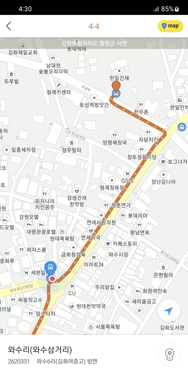 와수리발 군내버스 2대 가량이 로터리에서 대기하다 출발하는 것을 보고 있으니 어느덧 LED에 4-4번을 띄운 버스 또한 오는 것을 봅니다. 이 노선은 신수리까지 동서울행 직행과 똑같은 경로로 가는지라 와수리 시가지 기준으로 남쪽으로 내려가는 노선이 됩니다. 그 덕택에 이 노선을 타기 위해 와수리차고지 근처까지 굳이 올라가지는 않아도 된다는 점이 좋았습니다.
