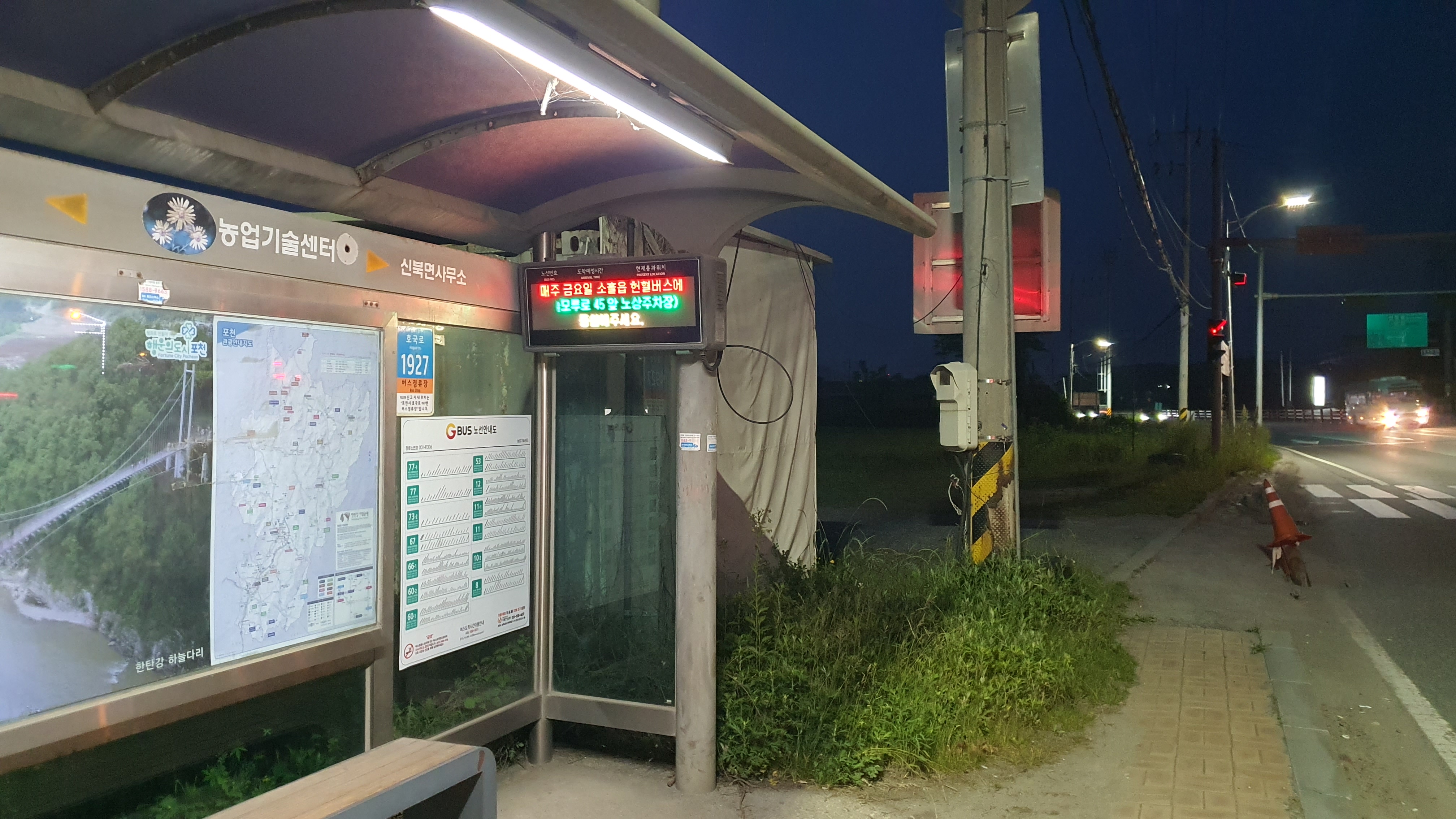 138-5번으로 같은 구간을 이동하면 10분 남짓 잡아야 하는 것은 물론, 길도 구불구불해서 속도 내기 만만치 않은데... 여러모로 터널의 위력을 실감하게 됩니다. 이후로는 다른 포천시내버스들과 별반 다를 거 없는 경로라 3006번을 어디에서 타야 하나 고민을 해보게 되는데, 3006번이 포천 시내가 아니라 신북면에 있는 경복대에서 출발한다는 것을 착안, 농업기술센터에서 환승하기로 했습니다. 언뜻 보면 신북면사무소에서 환승하면 될 것 같아보이겠지만, 3006번이 그곳에는 서지 않기 때문이었죠. ㅜ