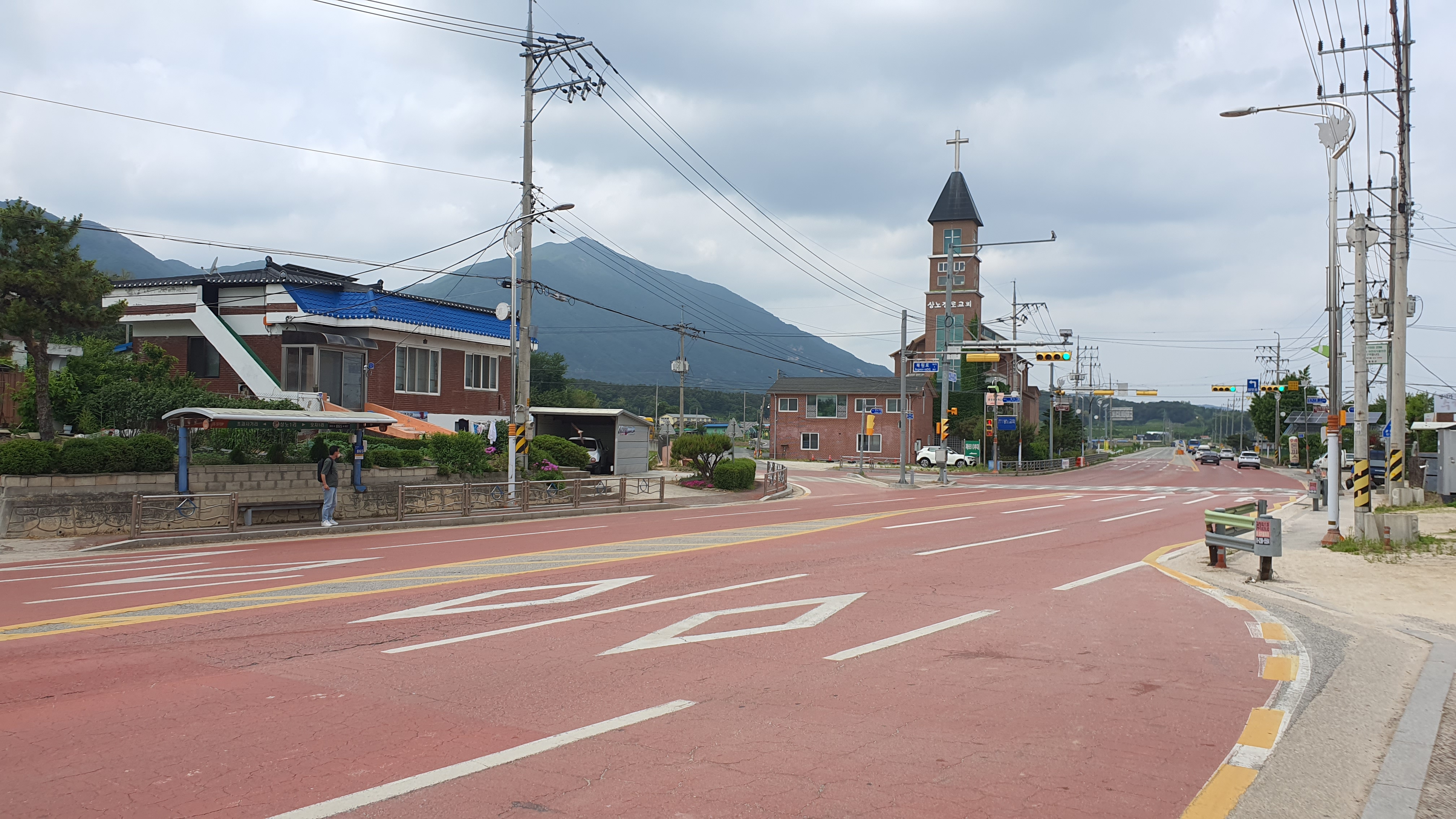 왕복4차선 도로에 집들이 조금 늘어서 있었던 상노1리 버스정류장. CU편의점이 바로 앞에 있는 것을 보았는데, 시간표가 붙어있길래 그것만 얼른 박고 정류장에서 현금 1700원 일발장전 준비를 하고 있으니 곧 직행버스가 도착합니다.