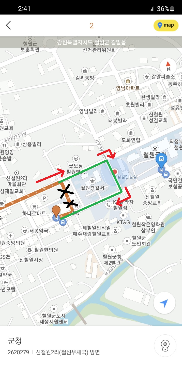 아무튼 관인 시가지 어귀에 있는 이 초과사거리에서 좌회전을 한 버스는 곧장 상노1리를 향해 달리게 되었고, 저는 상노1리에 내리기 위해 벨을 눌렀습니다. 계획을 짜면서도 예상했던 것이지만, 버스어플로 동송행 시외버스(3001-1)의 위치를 조회하니 동송 방향으로 버스가 곧 도착할 것을 포착했기 때문에 귀환에는 정말 아무런 문제가 없었죠.