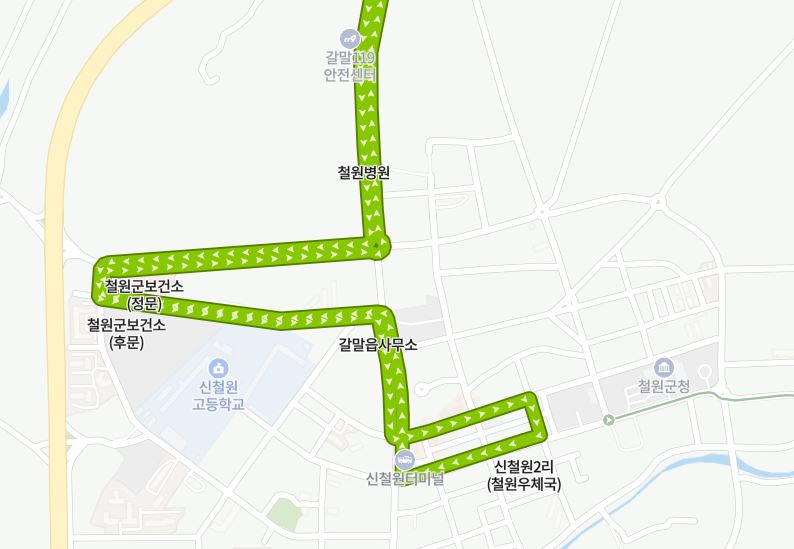[철원 공영10번(신철원2리,철원우체국~갈말읍사무소,철원보건소,문혜삼거리,문혜1리,문혜사거리,내대리,(→신동막리,동막리,내대2리,아랫상사리,(→윗상사리),(→중간상사리,아랫상사리,내대2리))~내대리 이하 역순)][환승]