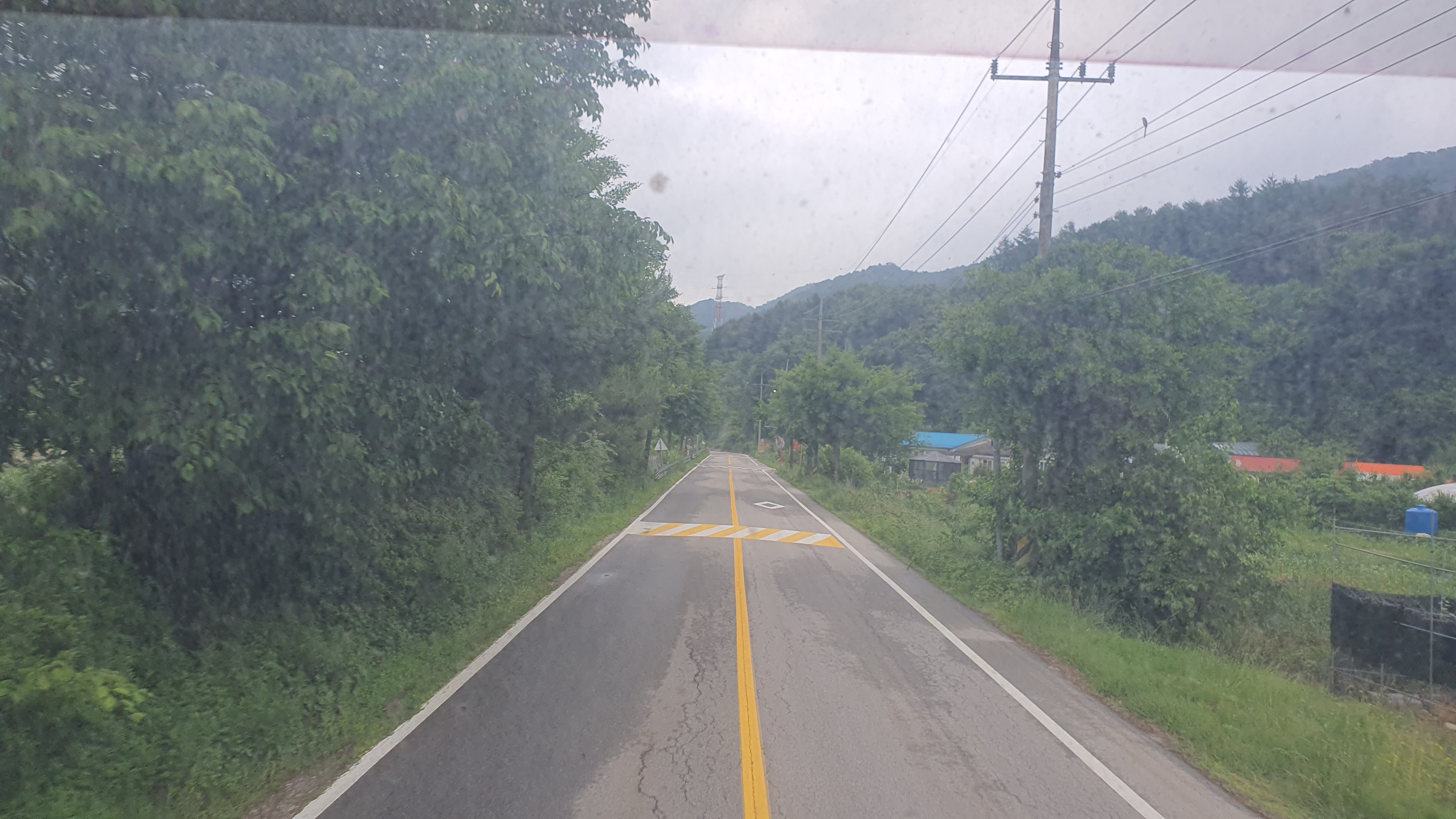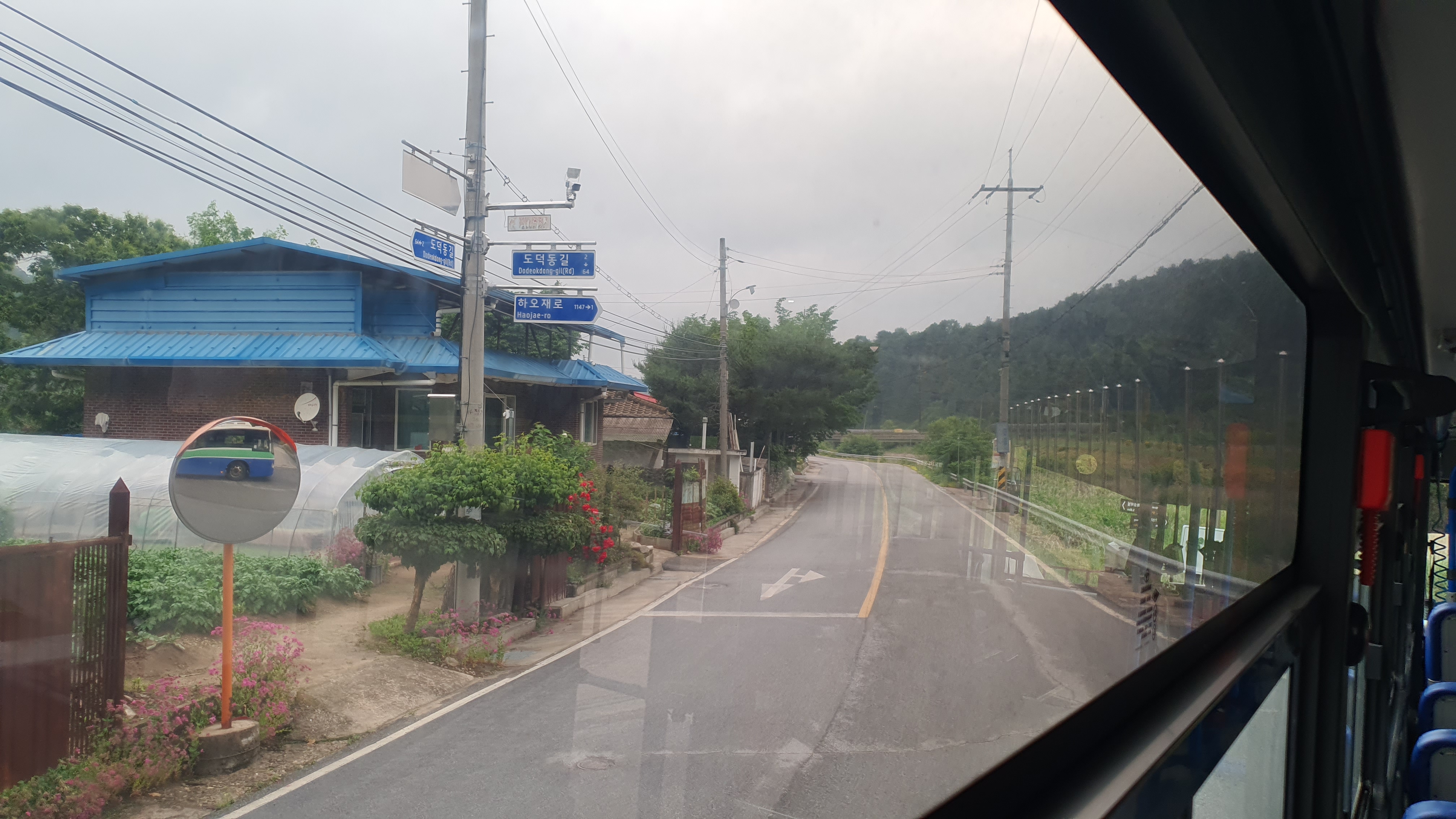 내대리를 지나니 삼거리가 나왔는데 버스는 우회전을 하여 동막리를 먼저 갑니다. 고갯길을 넘어가니 산과 나무 말고는 아무것도 보이지 않는 가운데, 버스는 버스어플 및 포털사이트 지도에 나온 경로대로 동막리를 반시계 방향으로 돌아주었습니다. 동막리는 드넓은 대지에 산과 집, 그리고 버스정류장이 있어서 풍경은 진짜 멋졌지만, 어딘지 모르게 음기가 강한 곳이라는 느낌이 드는 것은 어쩔 수가 없네요. -ㅅ-;;;